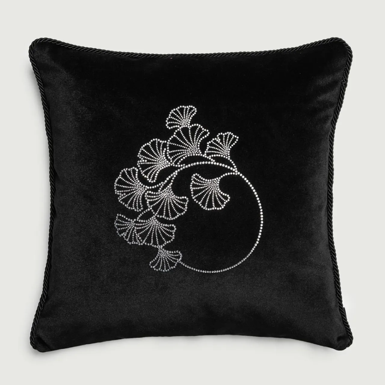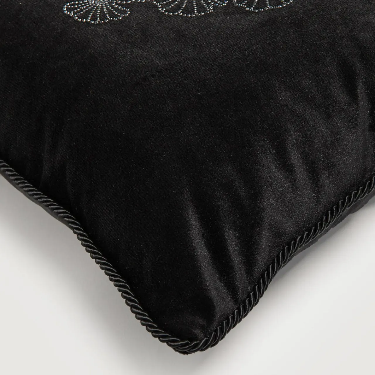 - Czarna poduszka z błyszczącym wzorem pasuje do aranżacji w stylu glamour.