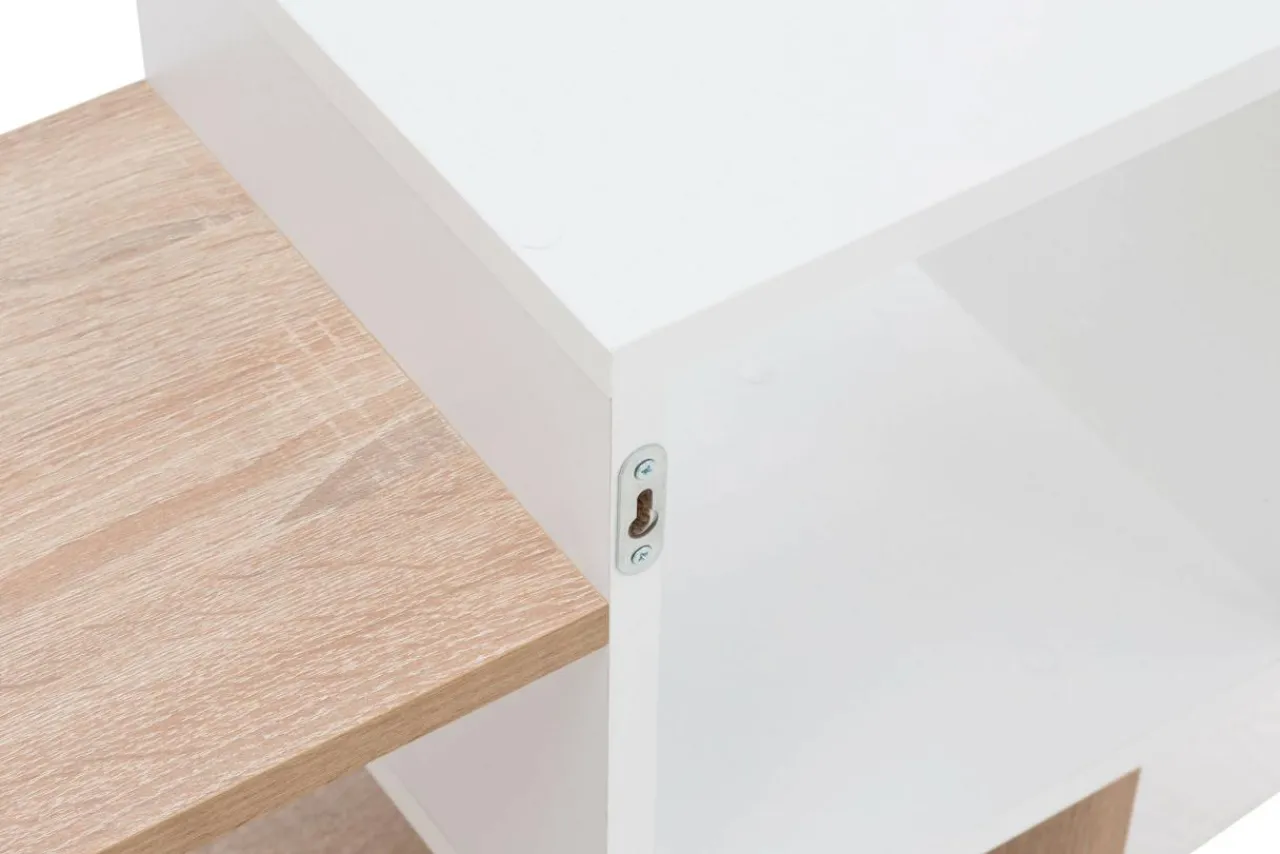 Połączenie 3 półek tworzy we wnętrzu ciekawy efekt wizualny. Natomiast wybarwienie w kolorze dąb sonoma i białym sprawia, że mebel wpasuje się w aranżacje urządzone w stylu nowoczesnym i skandynawskim.