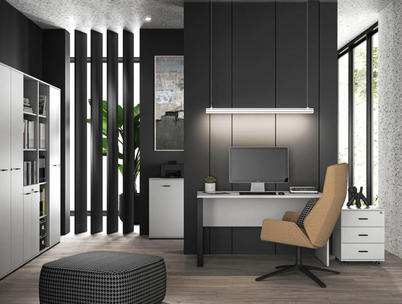 - Jasnoszare meble uzupełnią przestrzeń domowego gabinetu lub małej firmy.