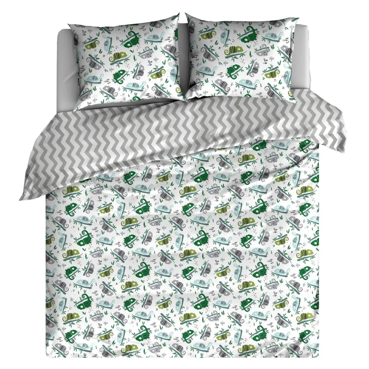 - Poszwa na kołdrę jest dwustronna. Zdecyduj, czy wolisz zatopić się w pościel z wizerunkiem zabawnego kameleona czy otoczyć się uniwersalnym wzorem – zygzak. Dzięki dwustronnej pościeli bawełnianej możesz niczym kameleon zmieniać wzór swojej pościeli w zależności od swojego nastroju.