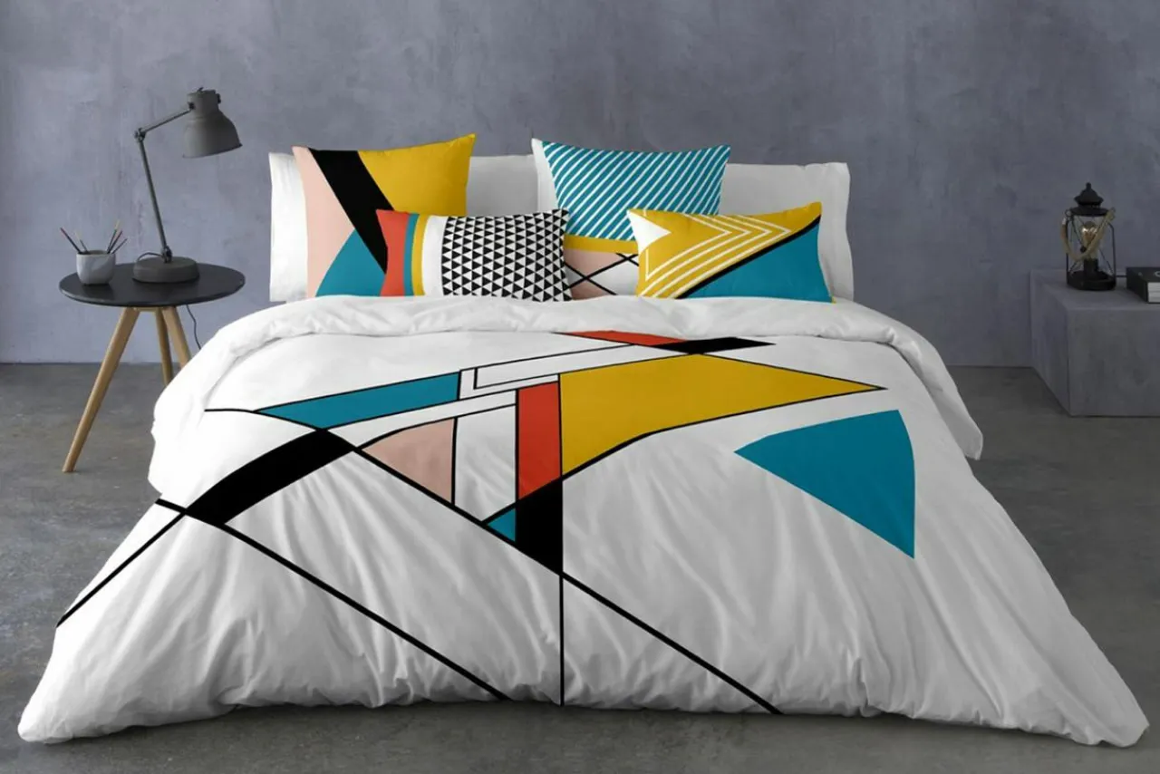 Nowoczesny wzór w kolorowe geometryczne figury uatrakcyjni Twoją sypialnię.