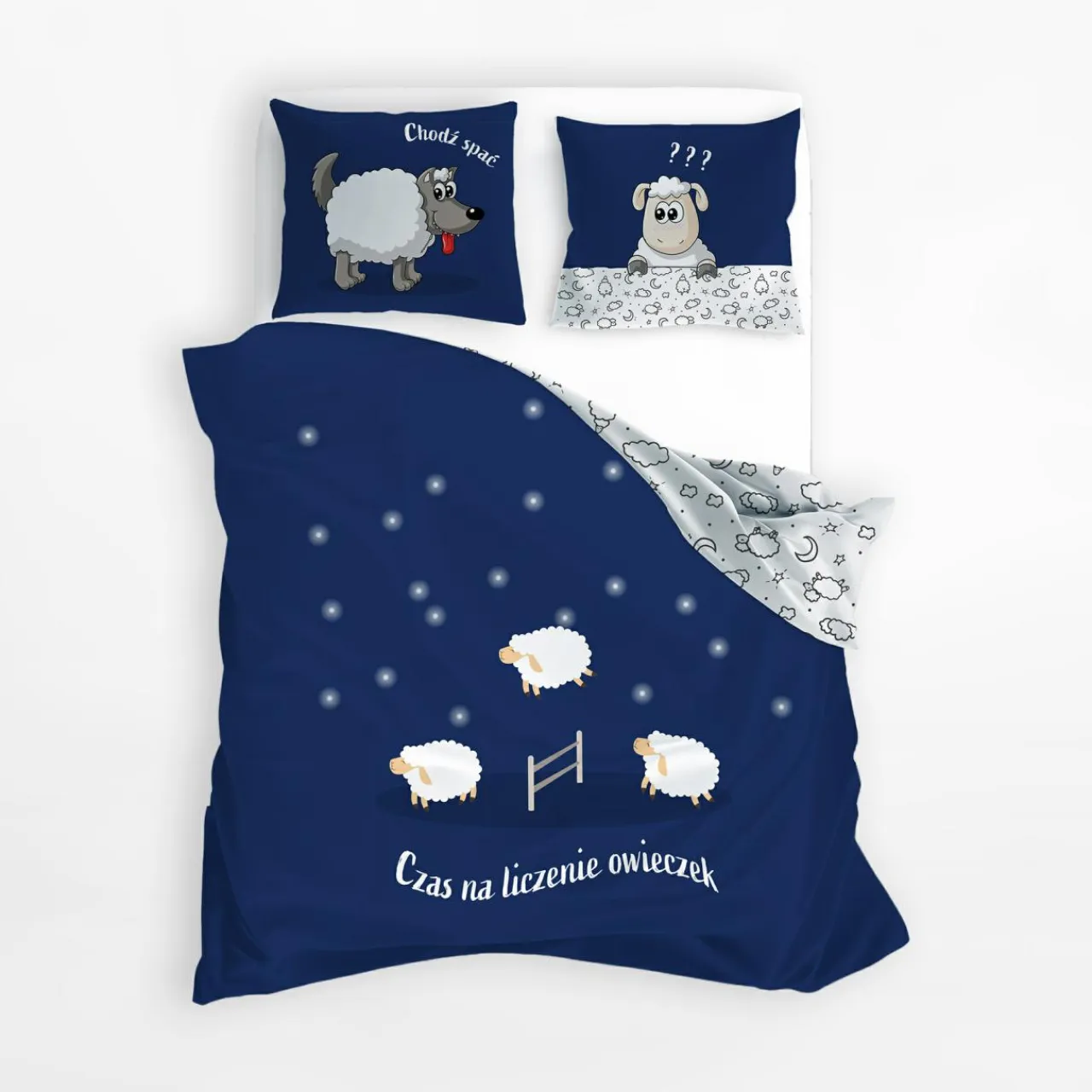Jeden.. Dwa.. Trzy… pościel SPOKO SPANKO z napisem „Czas na liczenie owieczek” przeniesie Cię do krainy snów. Owieczki skaczące przez płotek pomogą zrelaksować umysł, a granatowe tło pełne gwiazd wyciszy myśli.