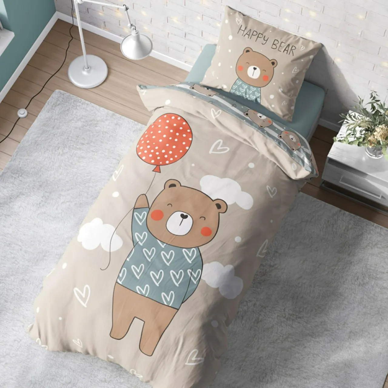 - Pościel wykonana jest z miękkiej w dotyku bawełny, bezpiecznej dla skóry dziecka. Materiał przyjemnie otuli Twojego malucha przed snem. O kolorowe sny zadba wesoły miś (happy bear) w uroczym sweterku w serduszka.