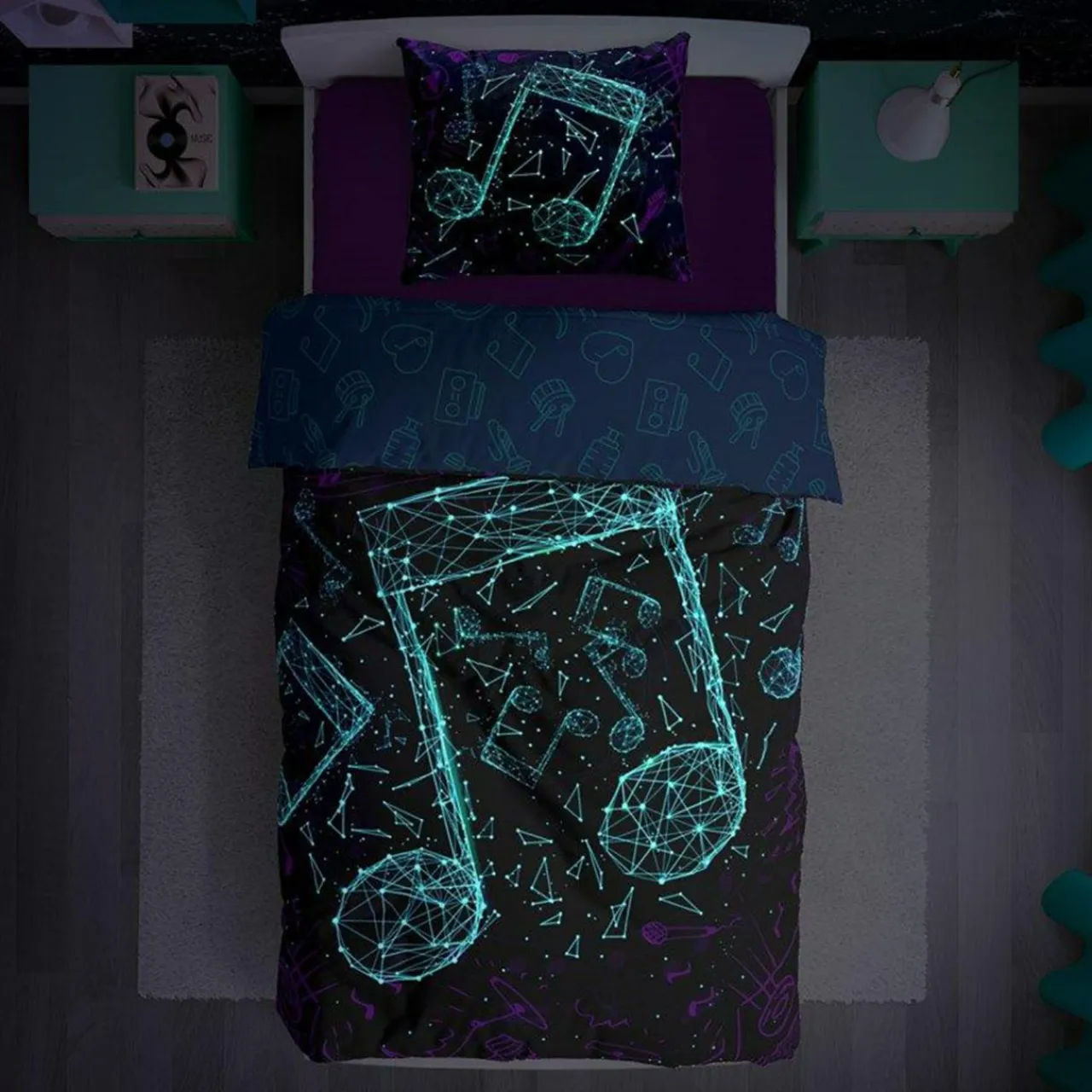 Twoja pociecha marzy o tym, by zostać gwiazdą rocka? Podaruj jej pościel NUTY FLUO. Młodzieżowy motyw nut pozwoli jej pokazać muzyczną pasję w wystroju swojego pokoju.