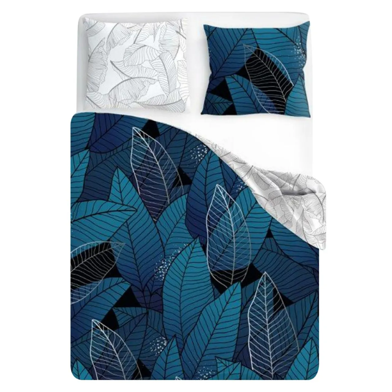 - Pościel jest dwustronna. Przód ma kolor niebieski, który jest ozdobiony wzorem liści, natomiast na rewersie nadrukowany jest szkic liści na białym tle.