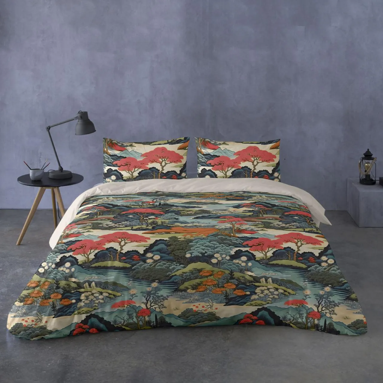 Kolorowy pejzaż wizualnie ożywi wnętrze nowoczesnej lub orientalnej sypialni.
