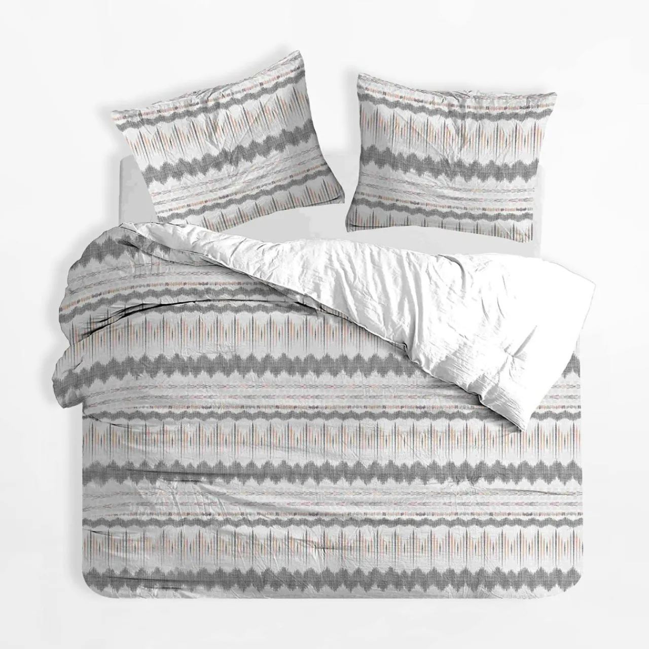 Pościel BOHOO w szaro-pomarańczowe wzory dopełni sypialnię w nowoczesnym stylu.