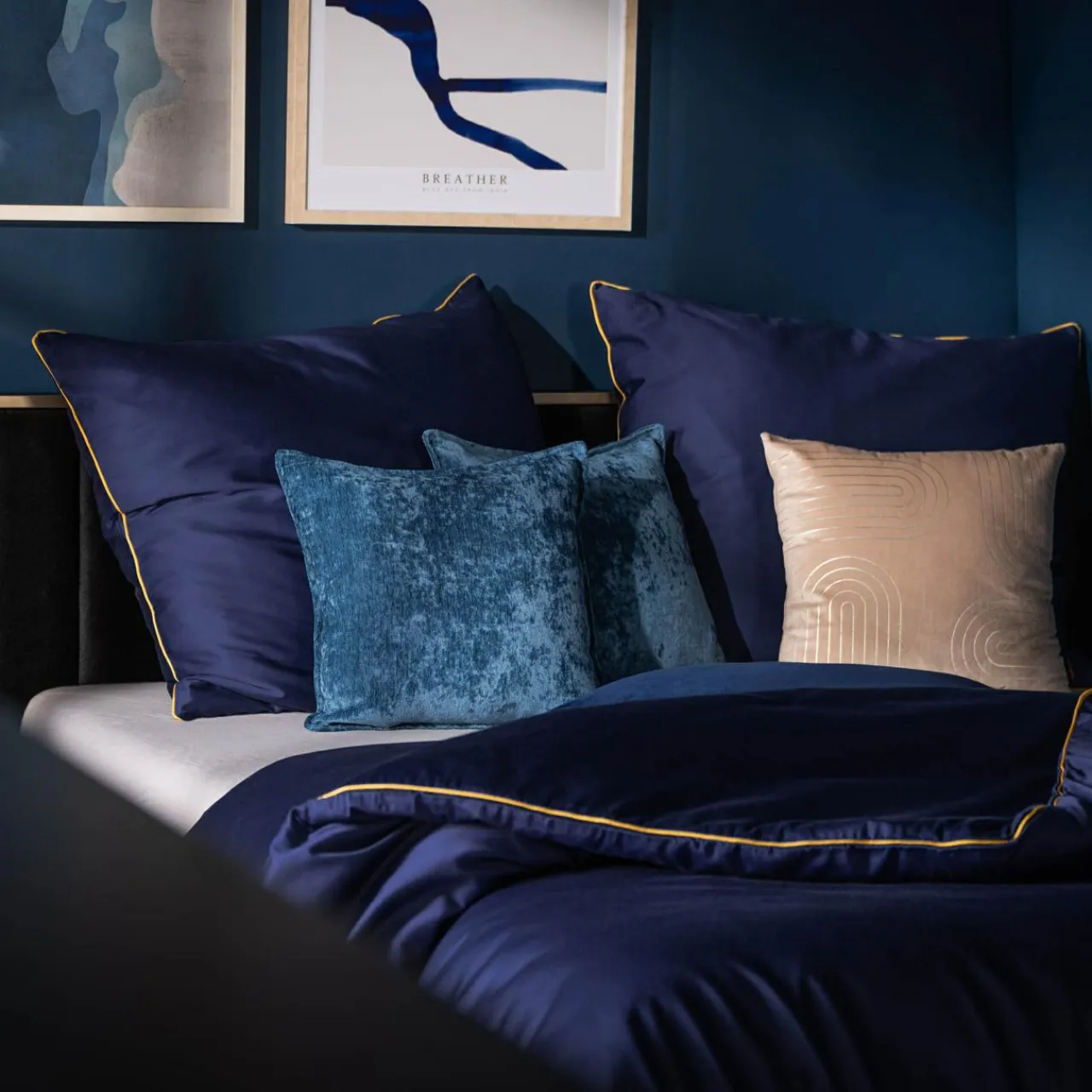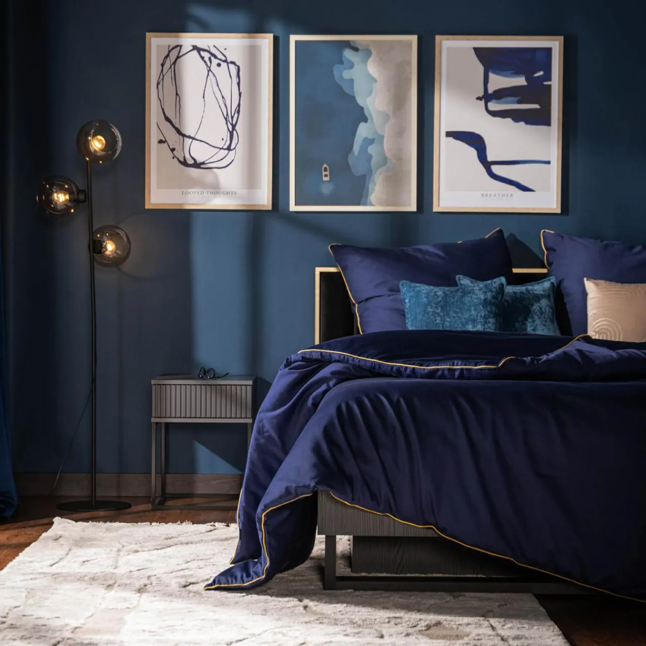 - Modny kolor granatowy podkreśli stonowane, nowoczesne wnętrze sypialni.