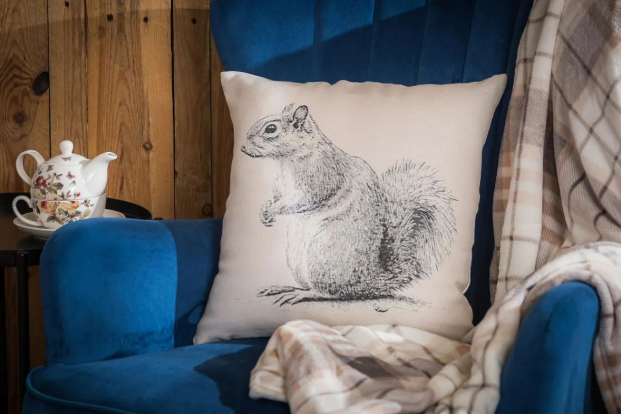 Dekoracyjna poszewka MOLLIE z wiewiórką będzie pasować do salonu lub sypialni w stylu skandynawskim.