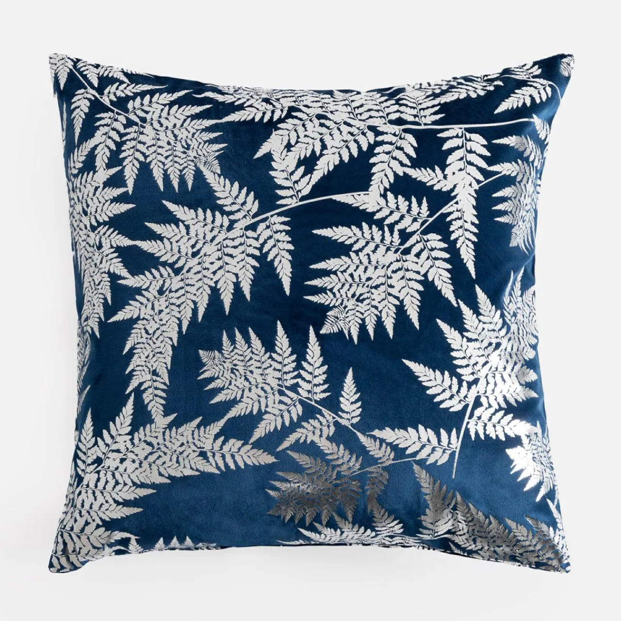 Tło poszewki ma ciemnoniebieski kolor – pasuje do kremowej lub musztardowej sofy.