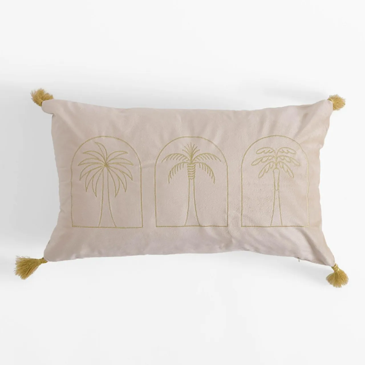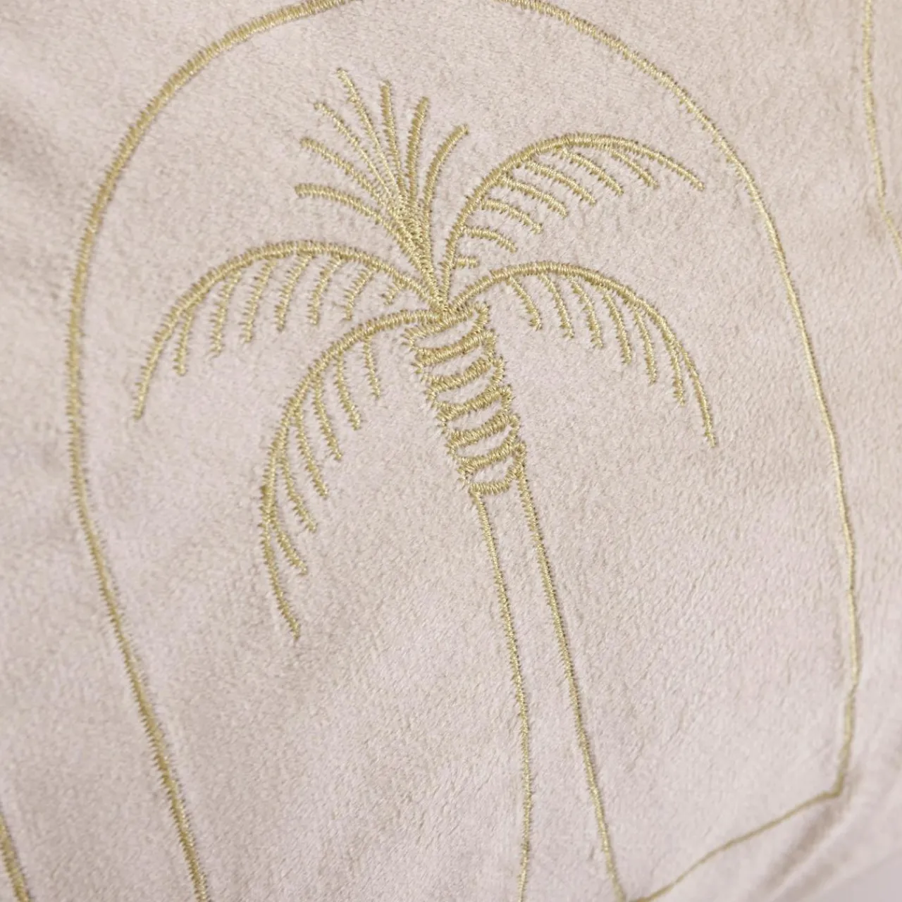 Welurowa poszewka DJERBA ze wzorem złotej palmy podkreśli aranżację o egzotycznym klimacie.