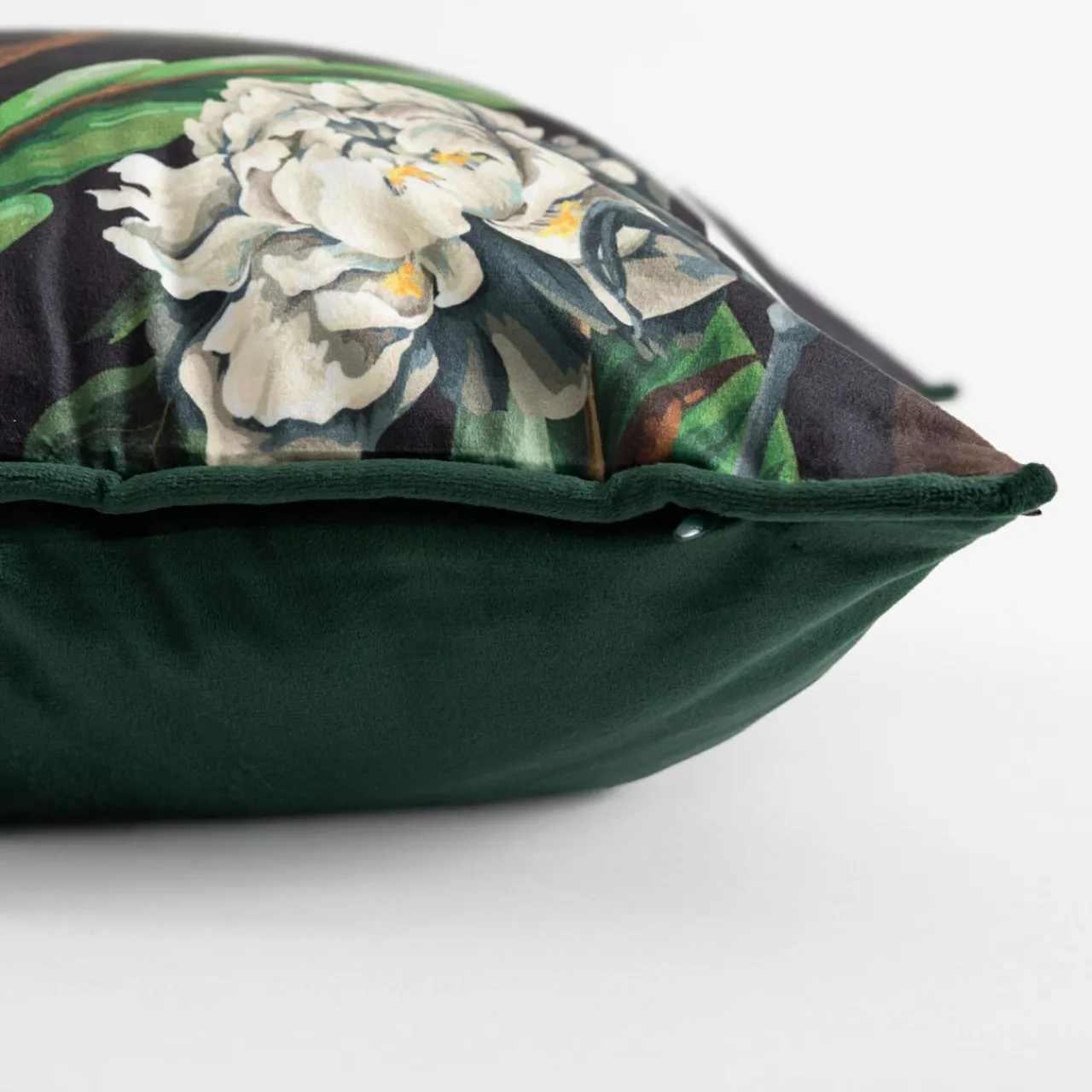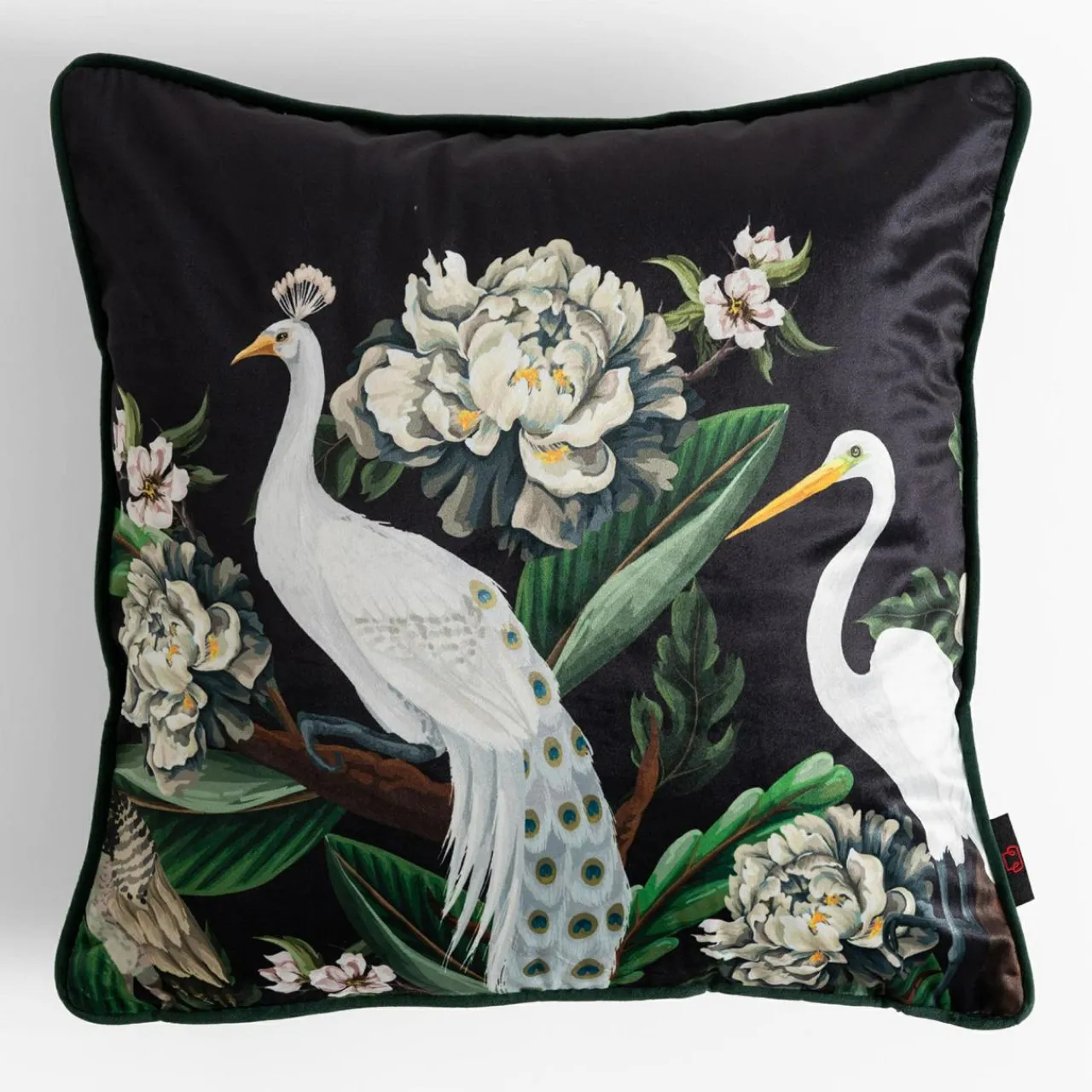 Ozdobna poszewka COLINA o czarnym kolorze z przyrodniczym motywem białych kwiatów i ptaków podkreśli wnętrze w stylu romantycznym.