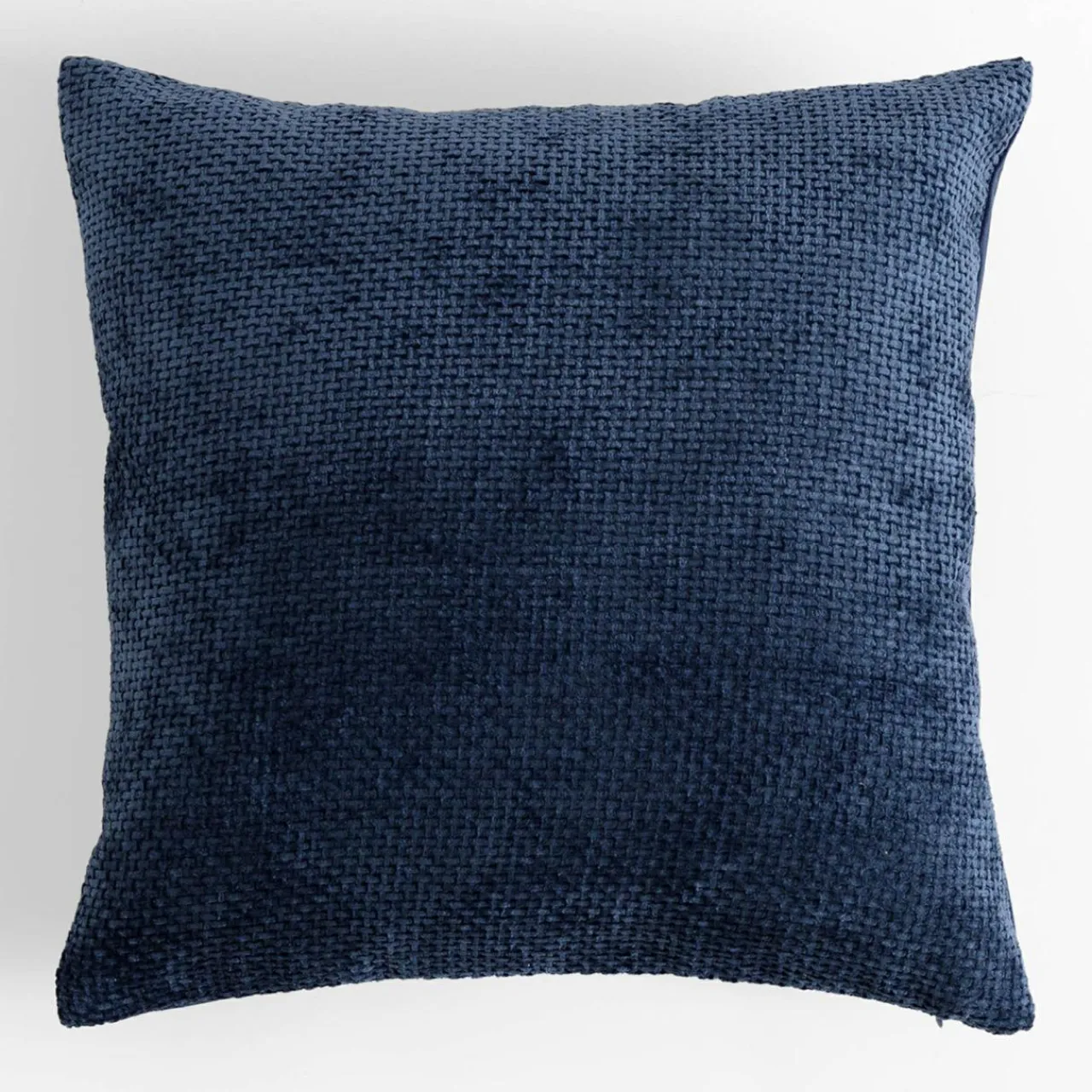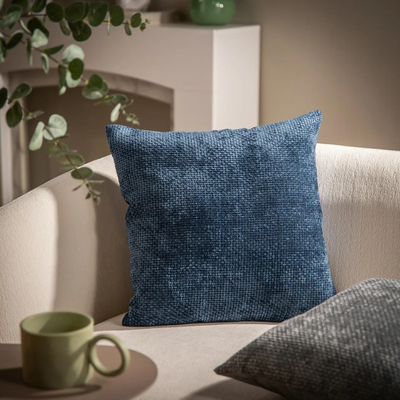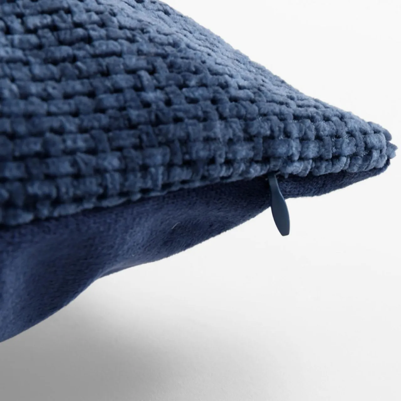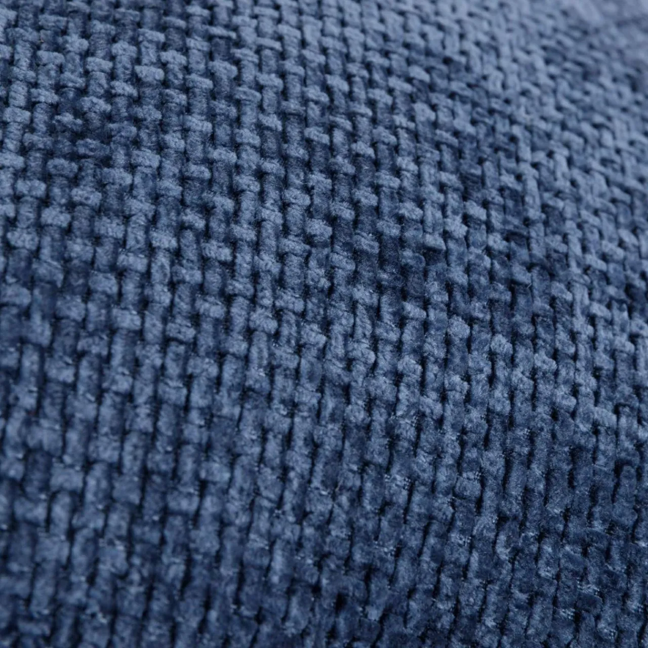 Ciemnoniebieska poszewka CARMON o szenilowej strukturze doda wnętrzu głębi na tle szarej, antracytowej lub czarnej sofy.