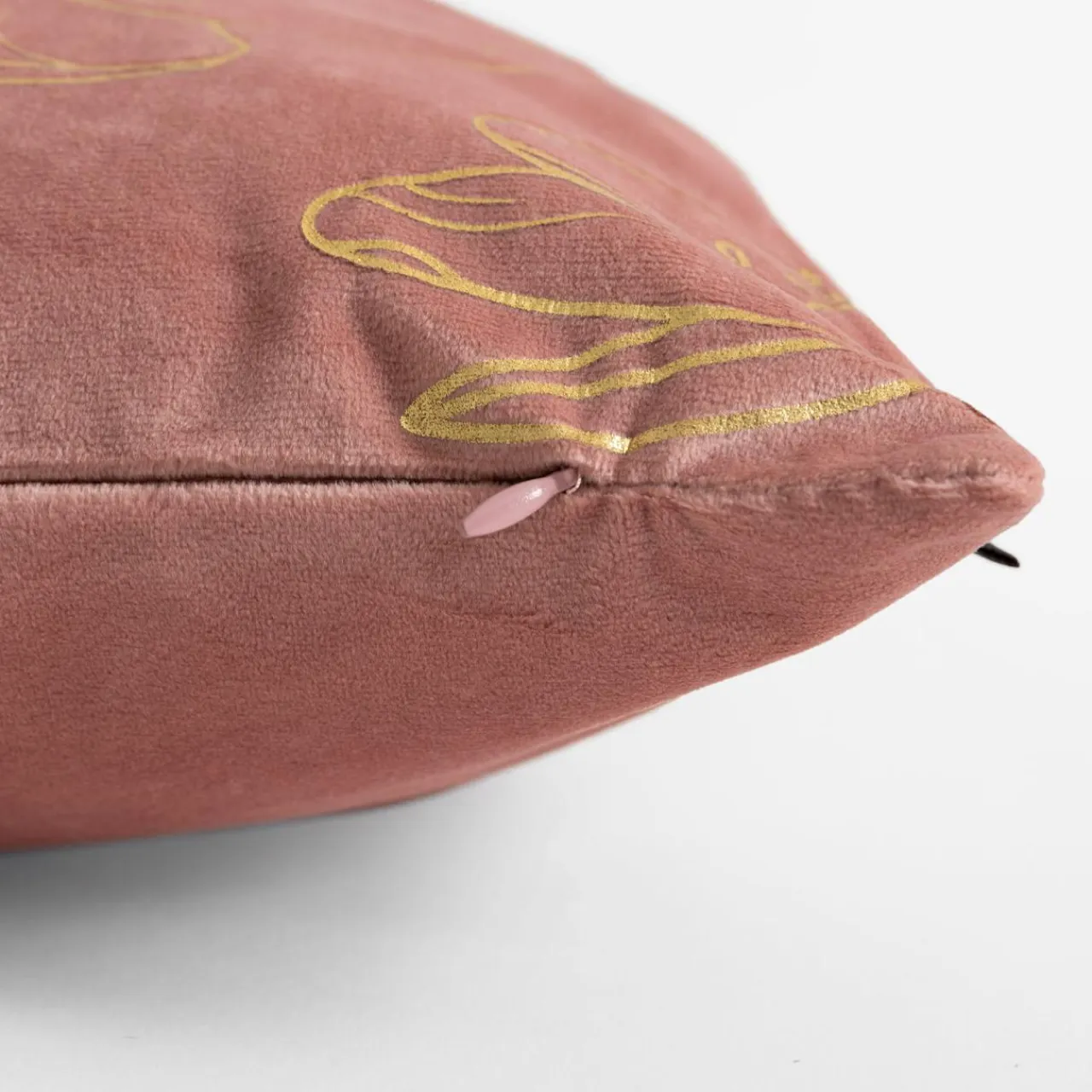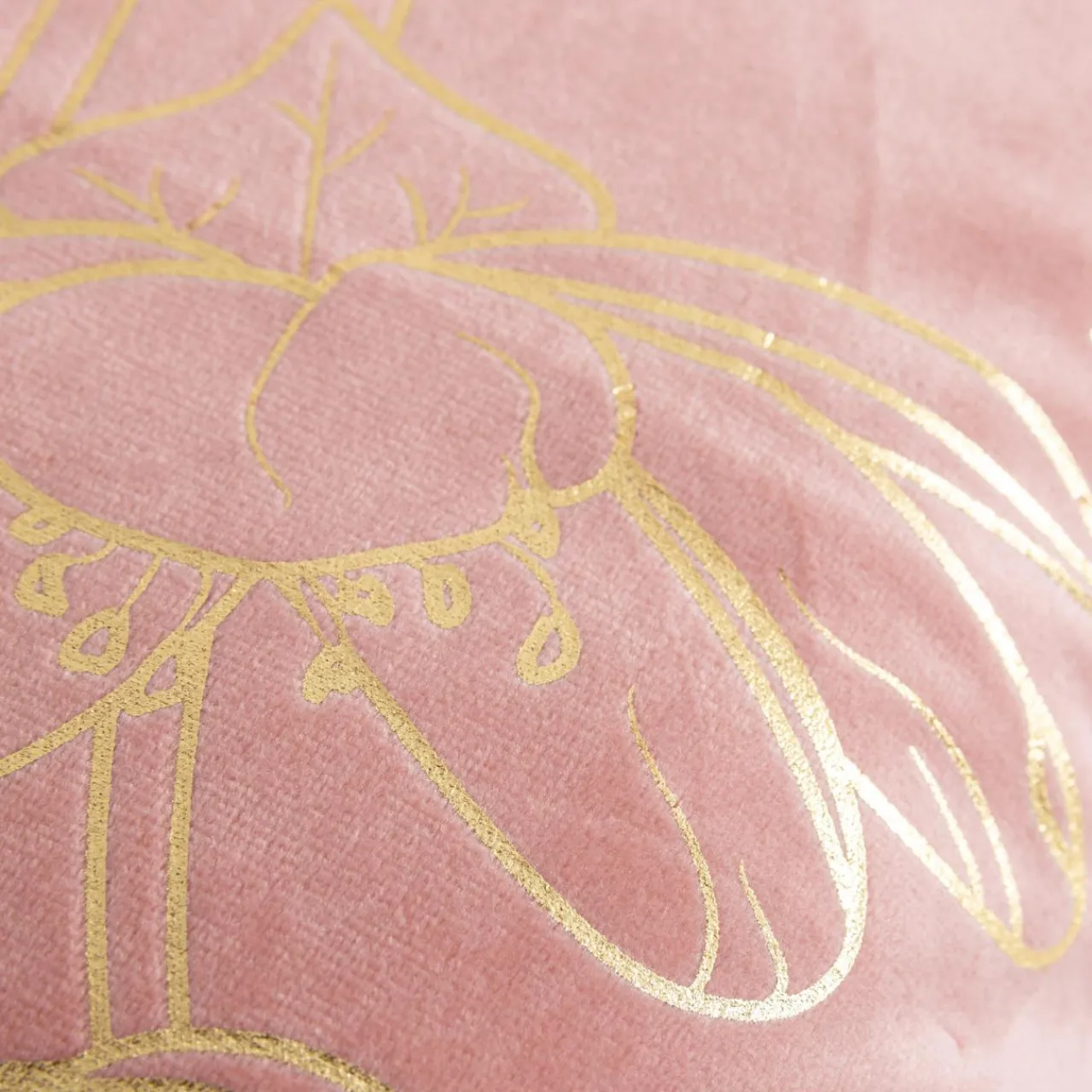 Poszewka welurowa CASILA o różowym kolorze przykuje Twoją uwagę złotym, kwiatowym wzorem.