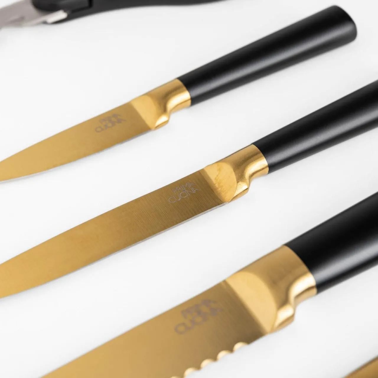 Zestaw noży COMO to funkcjonalne i stylowe rozwiązanie do nowoczesnej kuchni. Złote ostrza trzymane w pojemniku z przezroczystą zabudową są widoczne, przyciągając uwagę.