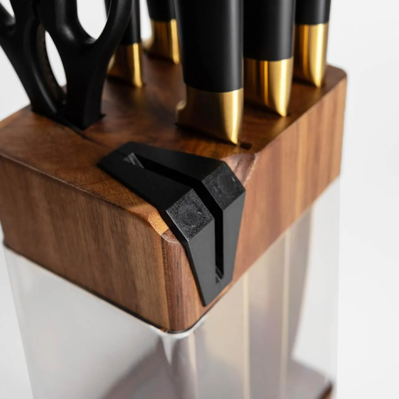- Blok do przechowywania wykonany jest z drewna akacjowego i tworzywa sztucznego.