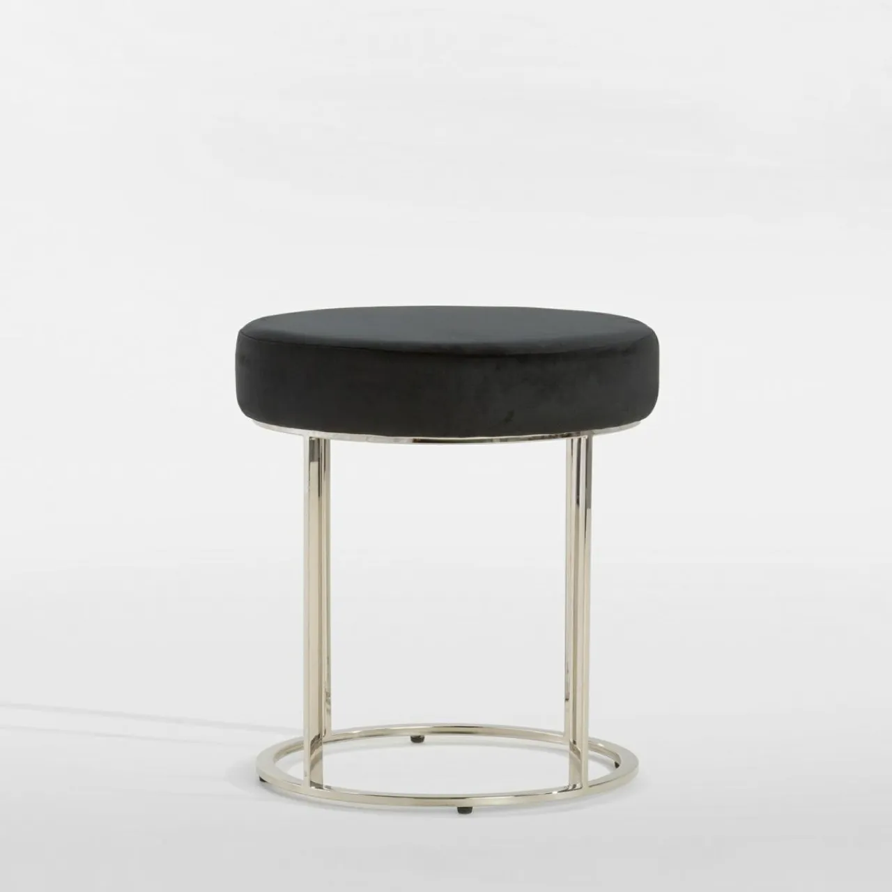 Okrągły puf EZIP sprawdzi się nie tylko w salonie, ale też przy damskiej toaletce. Połączenie czarnego weluru i srebrnej podstawy dopełni eleganckie wnętrze w stylu glamour.