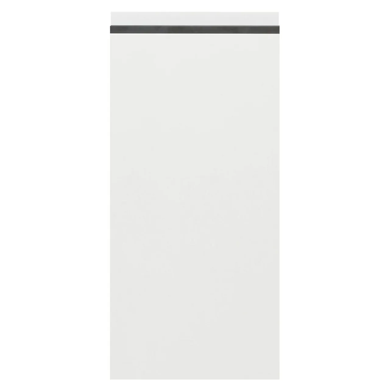 Dekor w białym kolorze z połyskiem sprawia, że front świetnie wygląda w połączeniu zarówno z jasnymi, jak i ciemnymi aranżacjami. Dodatkową zaletą jest uchwyt w formie frezu wykończonego czarną, aluminiową listwą.