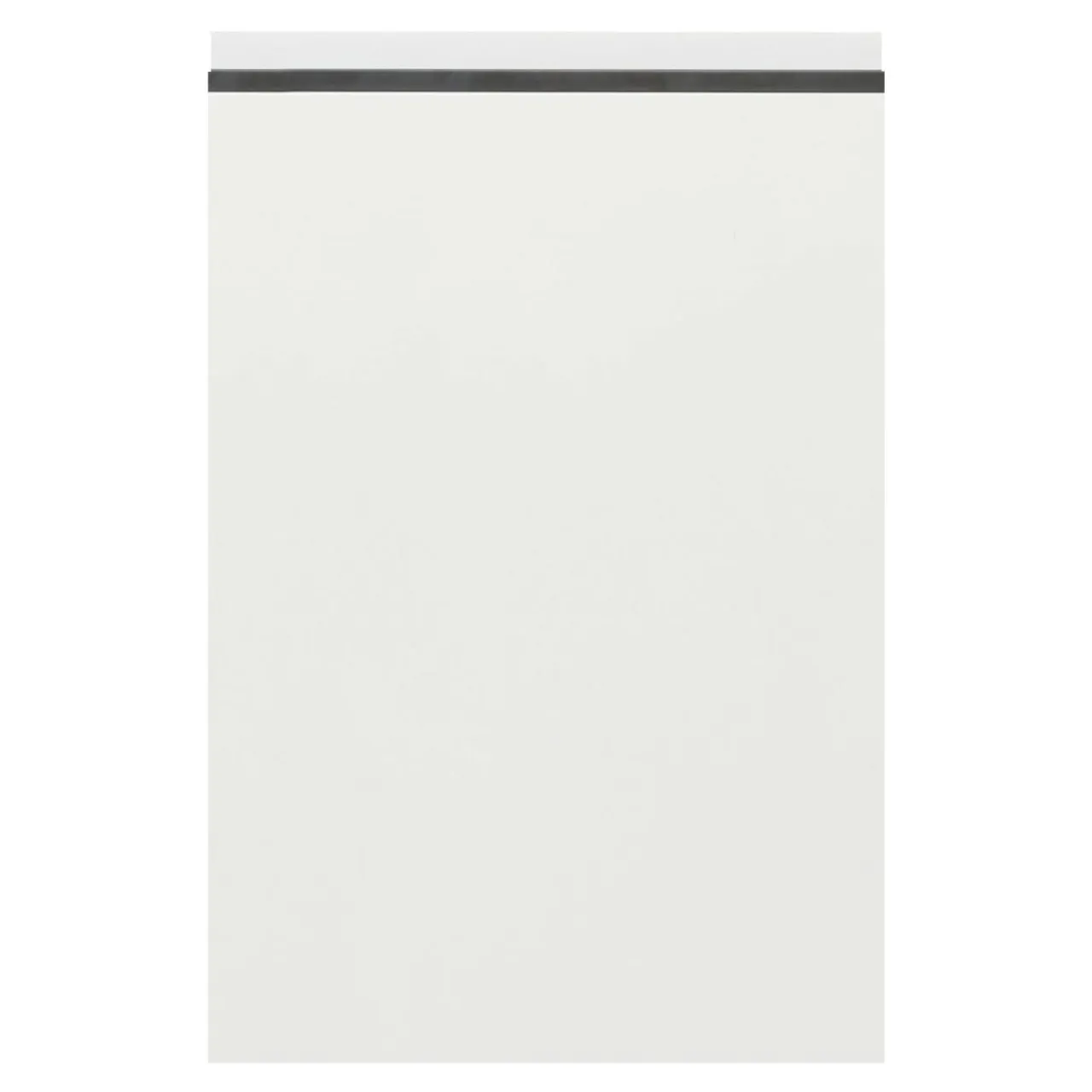 Dekor w białym kolorze z połyskiem sprawia, że front świetnie wygląda w połączeniu zarówno z jasnymi, jak i ciemnymi aranżacjami. Dodatkową zaletą jest uchwyt w formie frezu wykończonego czarną, aluminiową listwą.