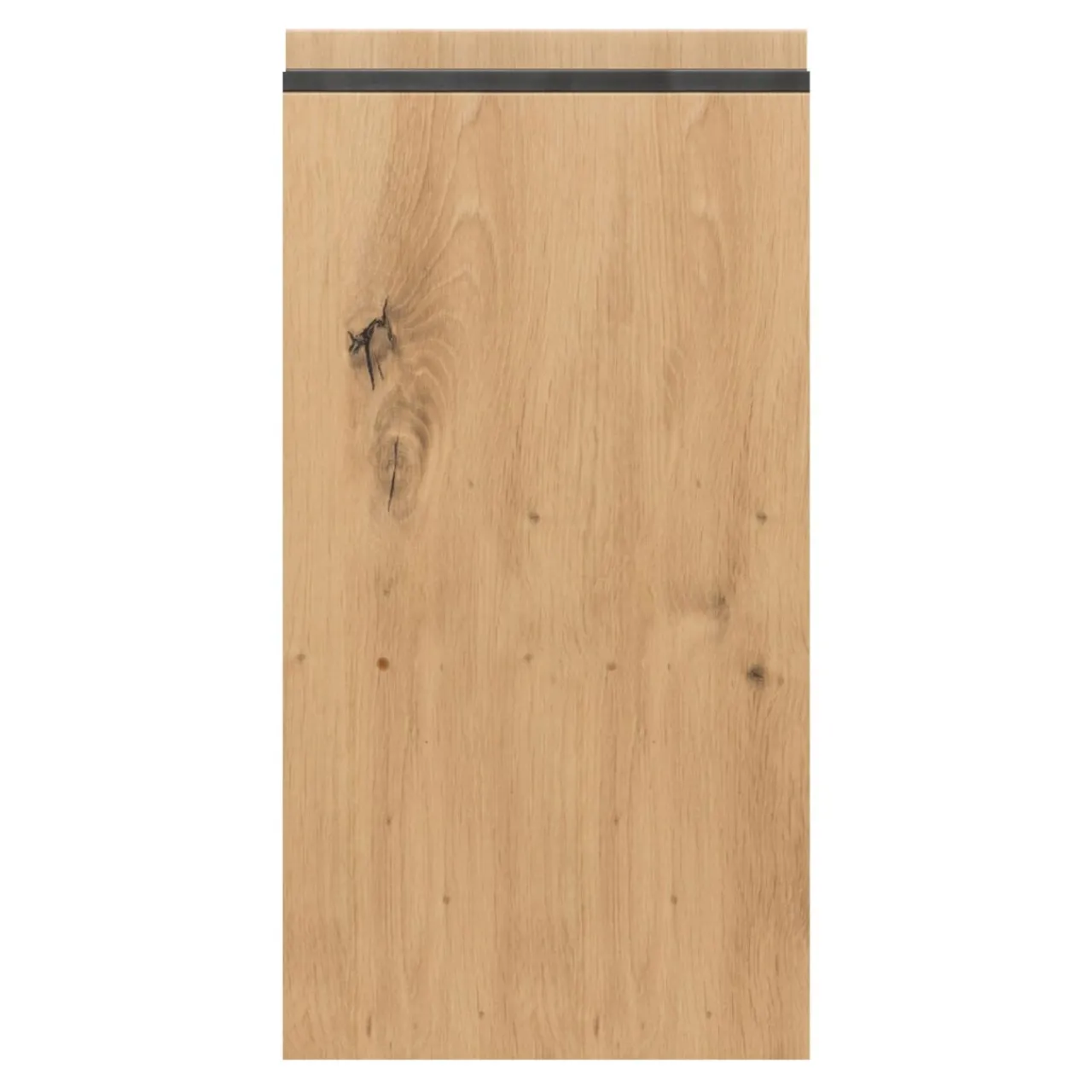 Dekor w kolorze drewna z doskonale widocznym usłojeniem sprawia, że front świetnie wygląda w połączeniu z jasnymi odcieniami bieli i szarości. Dodatkową zaletą jest uchwyt w formie frezu wykończonego czarną aluminiową listwą.