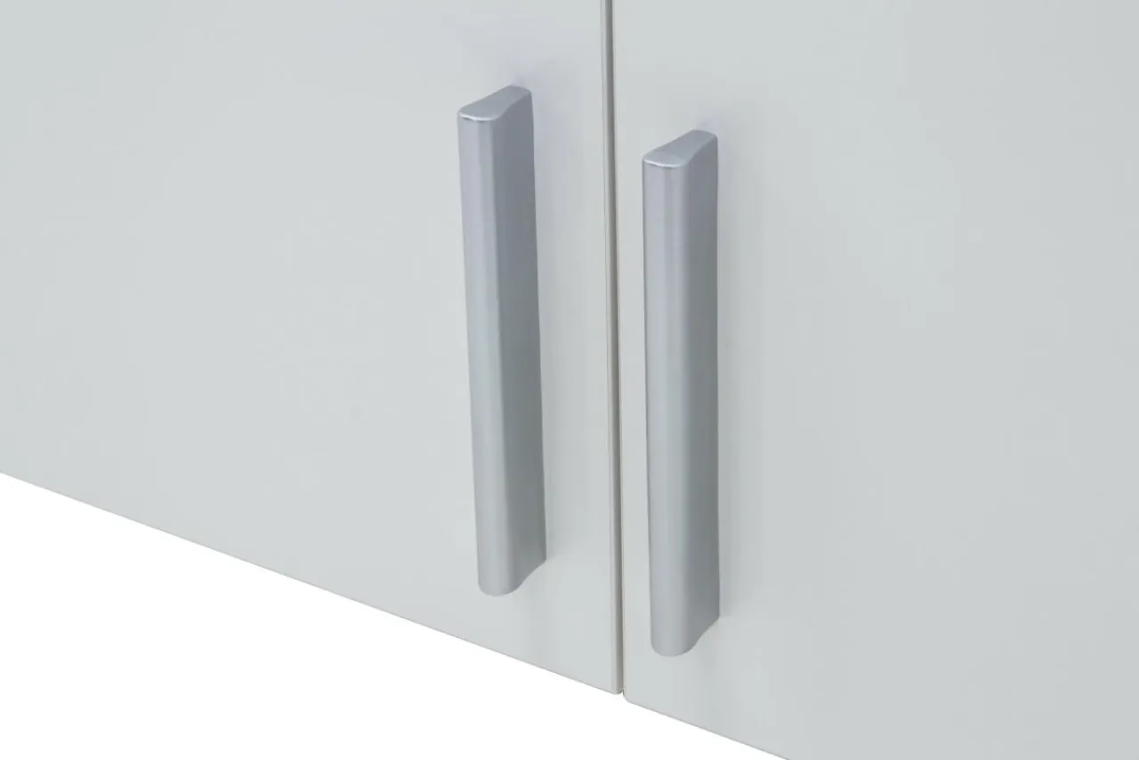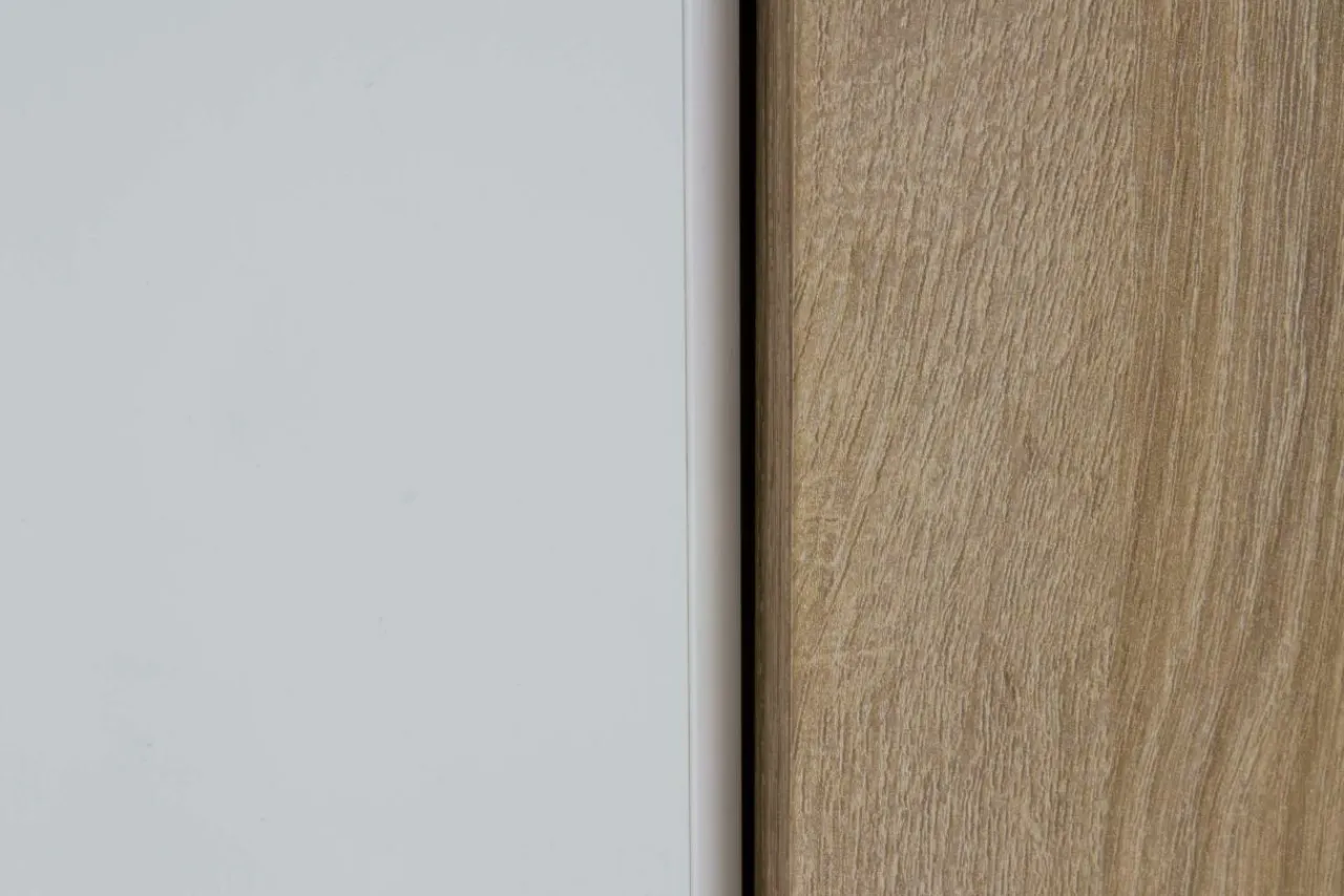 Korpus z dekoracyjnym nadrukiem w kolorze dąb sonoma, białe fronty wykończono na wysoki połysk. Proste srebrne uchwyty dodają wyrazistości.