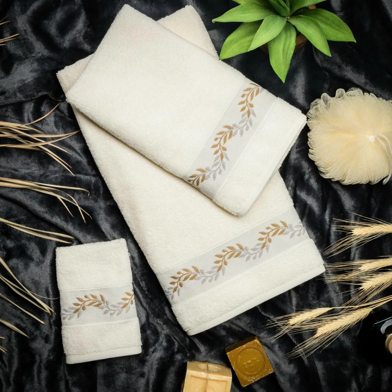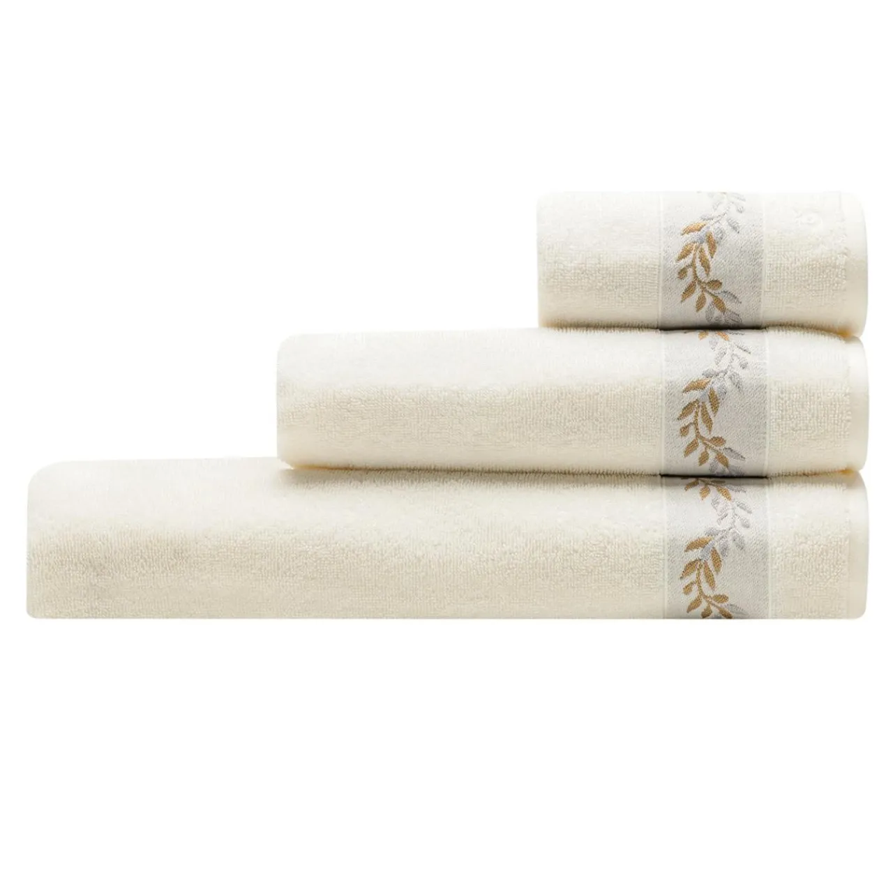 Komplet 3 ręczników BOTANIC w kolorze ecru to uniwersalna propozycja do niemal każdej łazienki. Delikatny wzór, inspirowany naturą wprowadzi ciepło do Twojego pomieszczenia.
