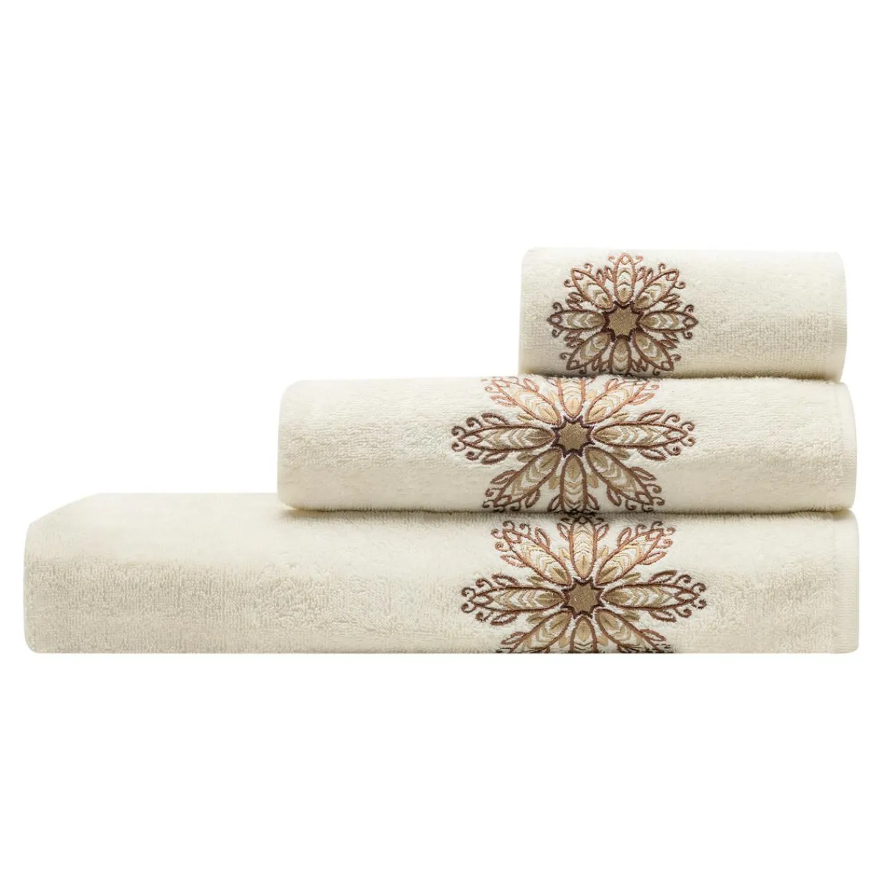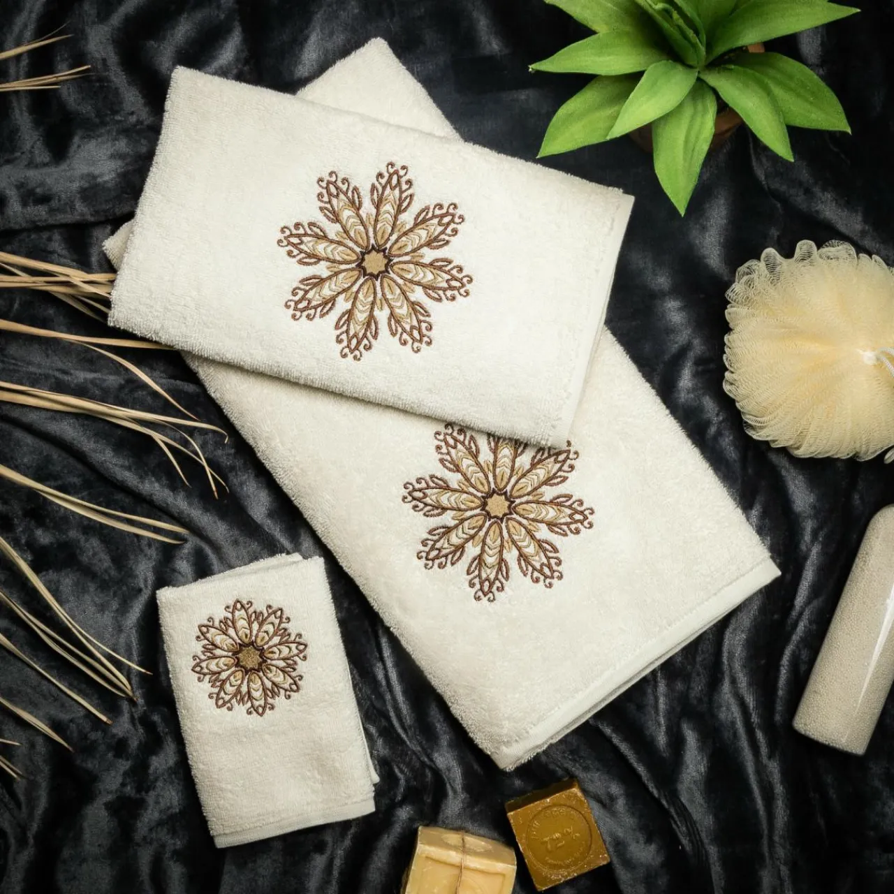 Komplet 3 ręczników ROZETA z minimalistycznym kwiatowym wzorem to doskonały wybór. Stonowana kolorystyka wpasuje się niemal w każde wnętrze, jednocześnie je ocieplając.