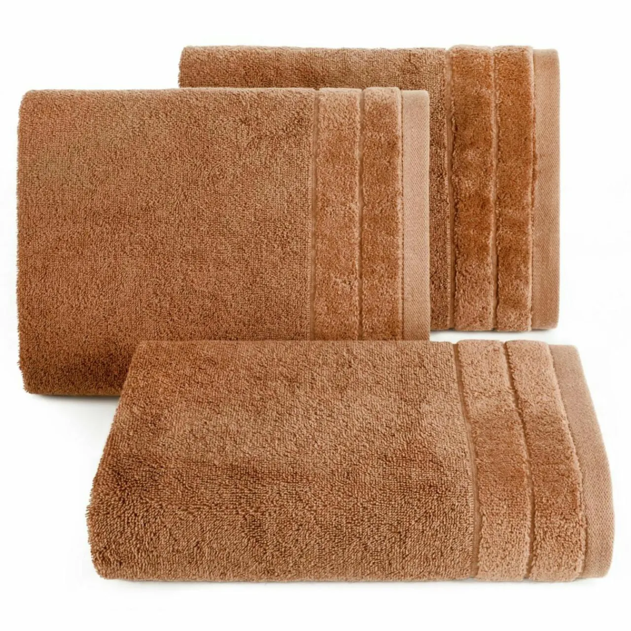 Ręcznik w ceglastym kolorze będzie ładnie się prezentował na tle czarnych ścian oraz brązu.