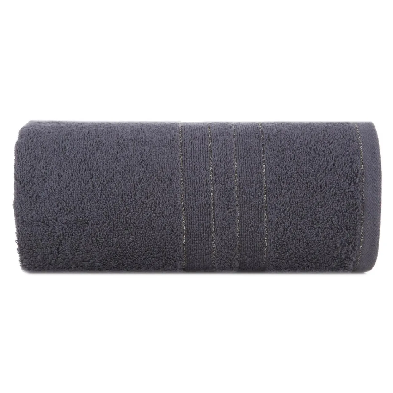 Grafitowy ręcznik GALA będzie ciekawie wyglądał na tle kremowych oraz beżowych płytek w łazience.