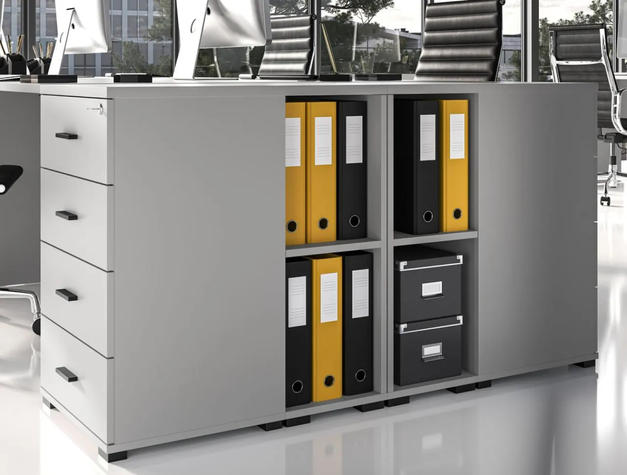 - Dostawki w formie szafek i blatów biurek dopełnią meble, tworząc nowoczesne miejsce pracy.