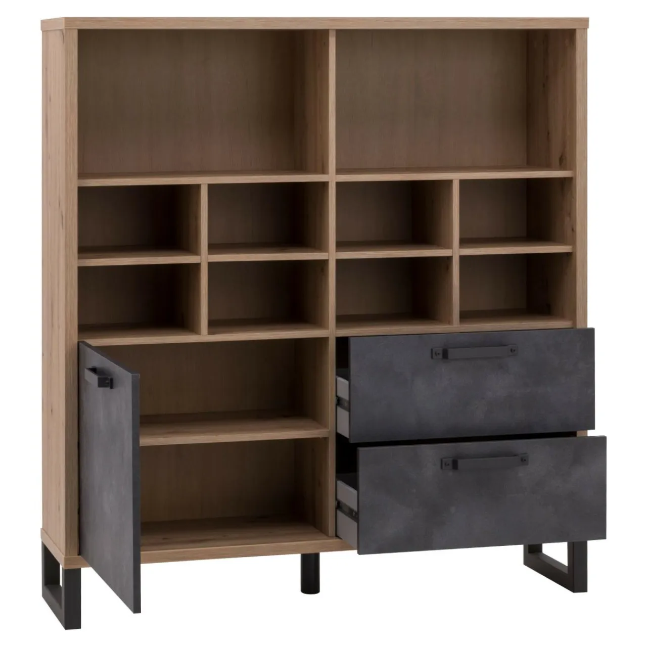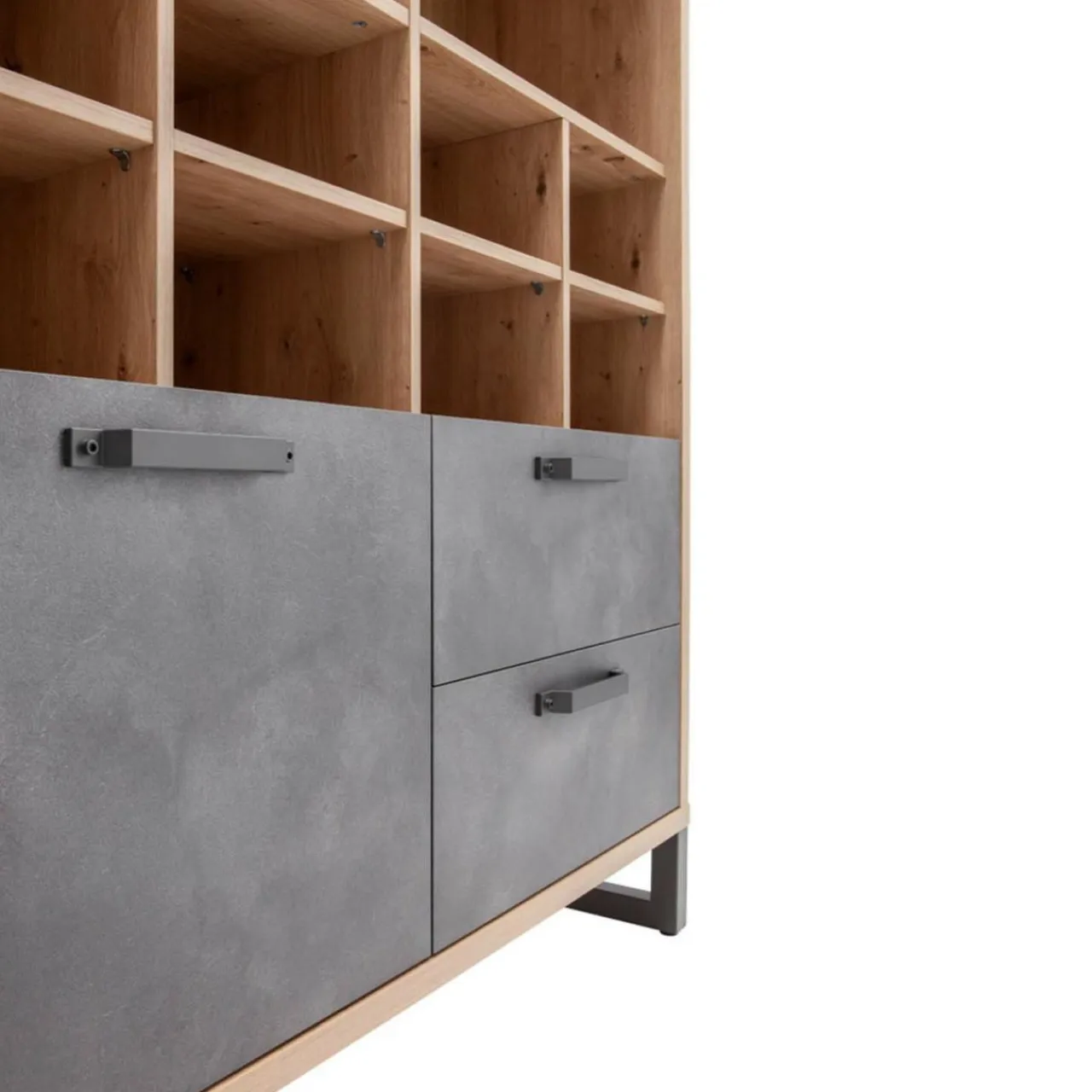Industrialna stylistyka regału świetnie zestawia jasną kolorystykę w barwie dębu artisan z ciemnym, imitującym beton dekorem nawiązując do surowego minimalizmu japońskiego. Regał pięknie wyróżni się więc we wnętrzach nowoczesnych, industrialnych oraz tych, których aranżacja hołduje prostocie i kolorystycznemu ascetyzmowi.