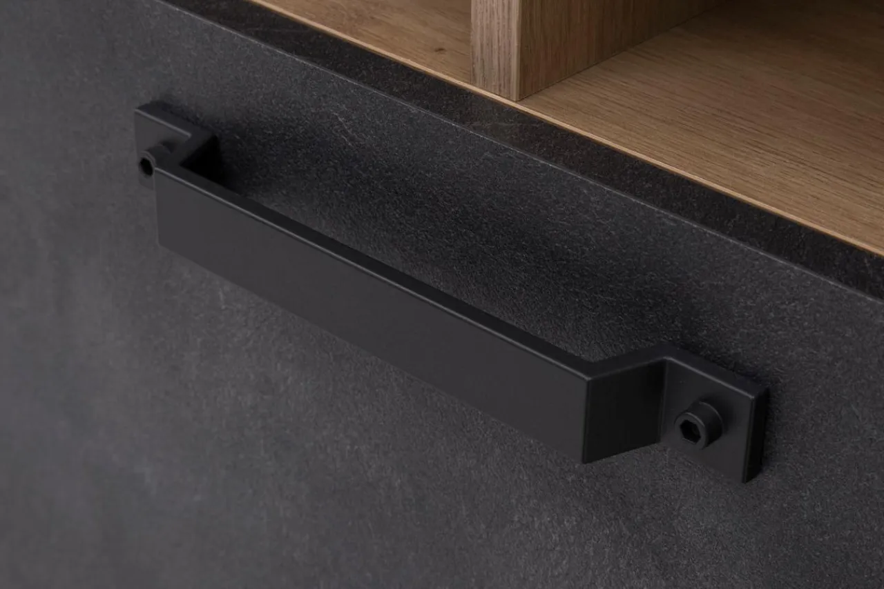 - Niezwykle stylowe, charakterystyczne nogi regału wykonano z metalu, który pięknie koresponduje kolorystycznie z wykończeniem frontów.