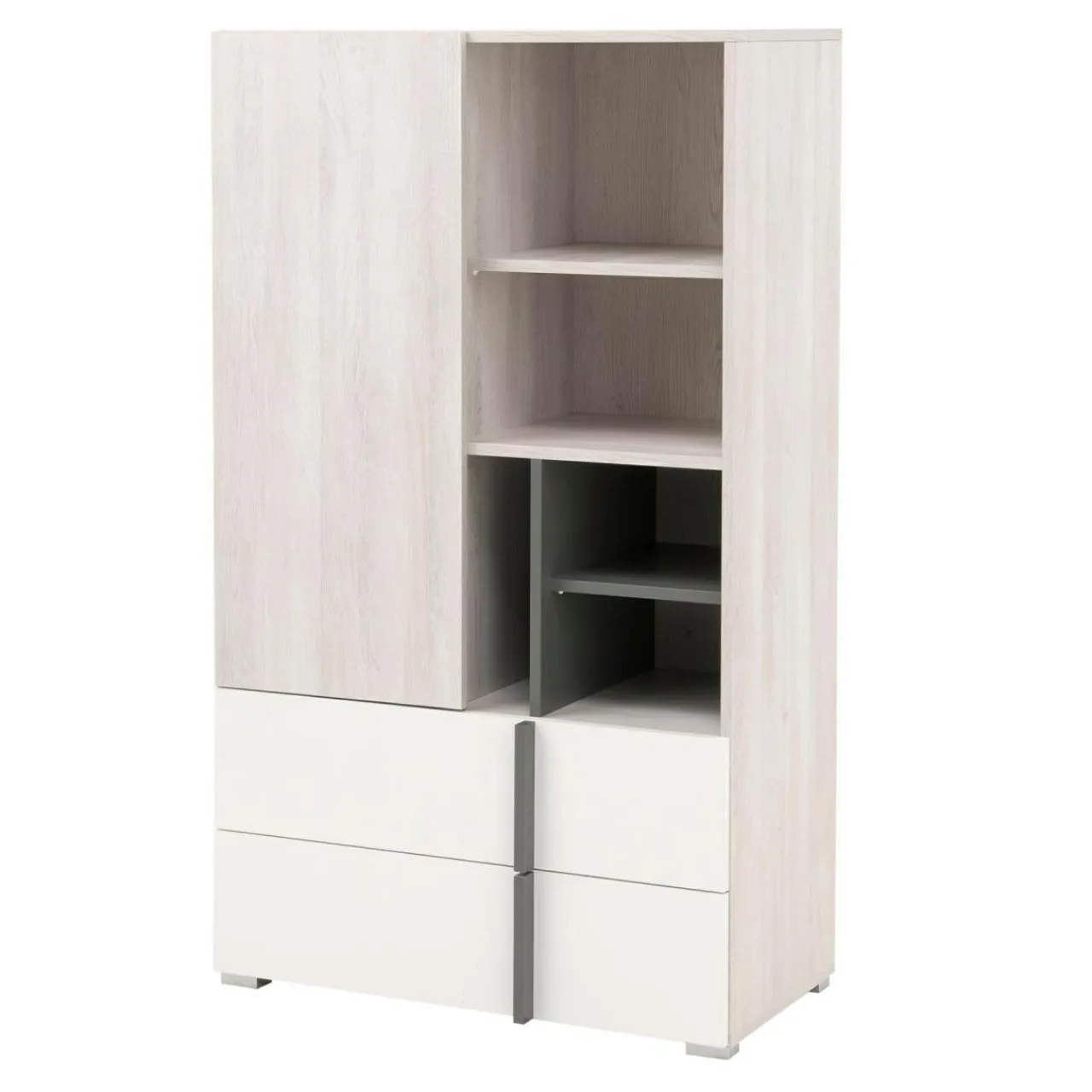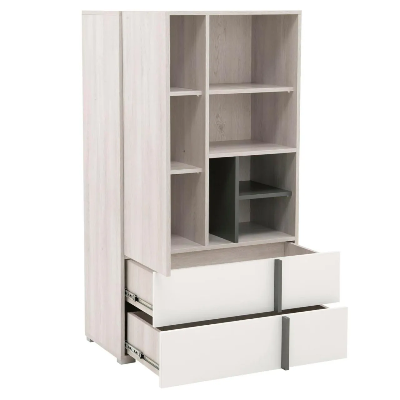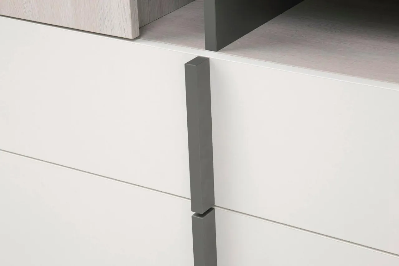 - Wykończenie w kolorze antracytu, białego matu i białego dębu Wilson sprawia, że regał REMO z łatwością wkomponujesz w jasne, nowoczesne wnętrze.