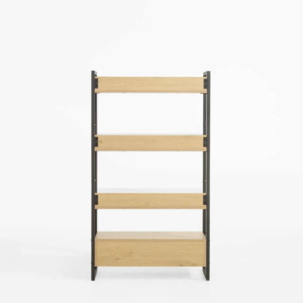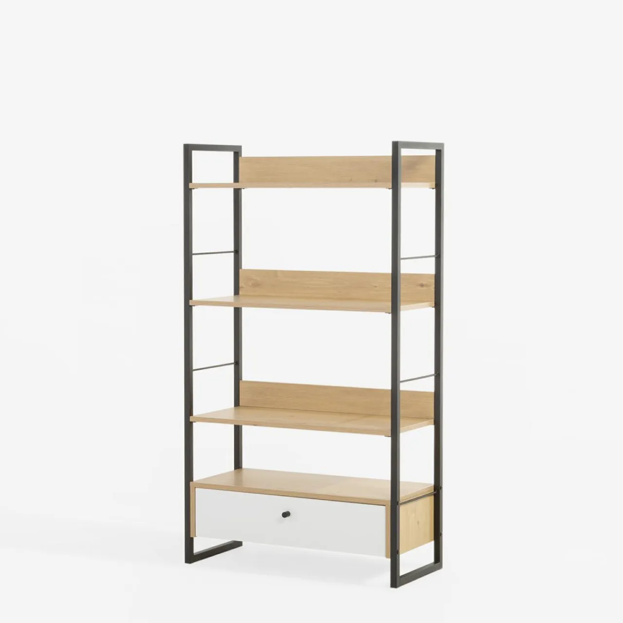Regał z szufladą biały LINEARDO to mebel, który doskonale sprawdzi się w salonie, sypialni, gabinecie czy pokoju dziecięcym. Połączenie czarnej stalowej ramy z jasnymi półkami i białą szufladą nadaje mu nowoczesny, inustrialny charakter. Jest praktycznym rozwiązaniem, które pozwala uporządkować przestrzeń.