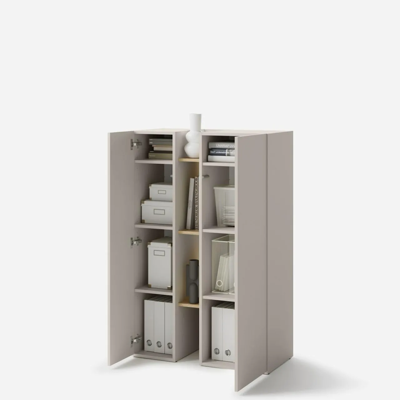 Niski regał SIGMA to świetne rozwiązanie, jeżeli potrzebujesz zarówno wyeksponować jak i schować niektóre rzeczy. Regał oferuje otwarte półki oraz te ukryte za pełnymi drzwiami. Przechowuj książki, dekoracje, pamiątki i ozdobne pudełka.