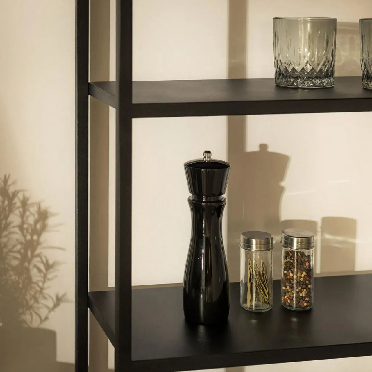Wykonane z metalu i wykończone eleganckim czarnym kolorem ramy regału doskonale podkreślają kolorystykę kuchennego wnętrza.