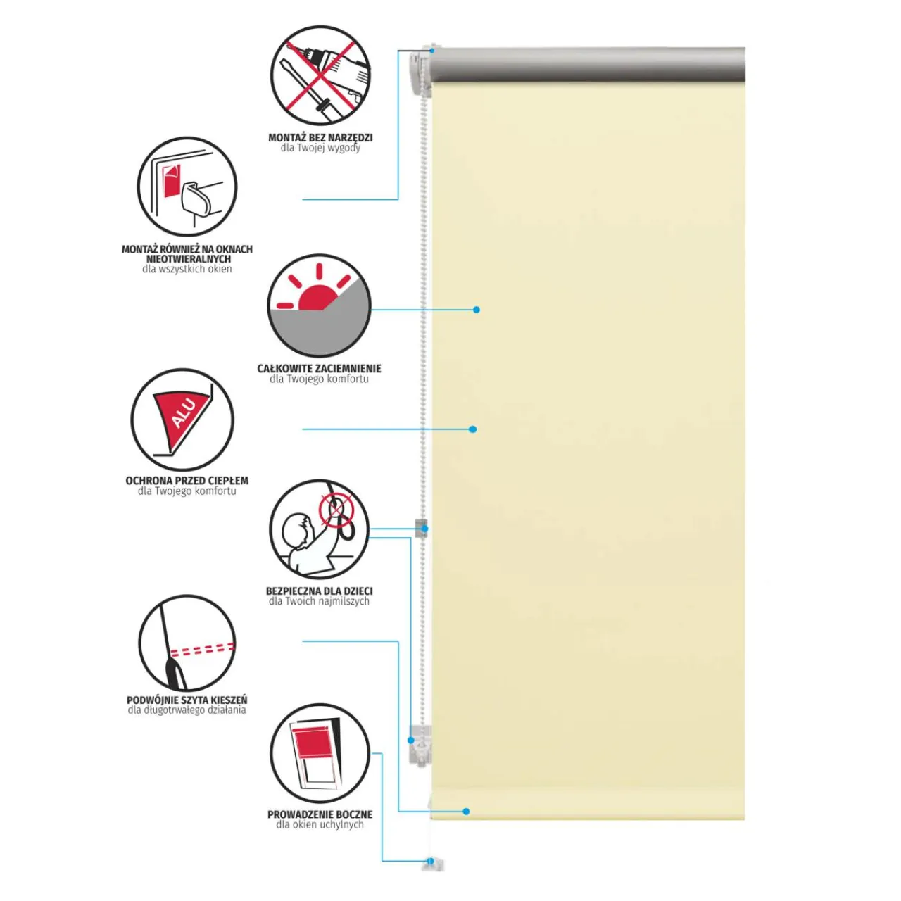 - montaż bez użycia narzędzi – roleta do zawieszenia lub przyklejenia na skrzydło okna;