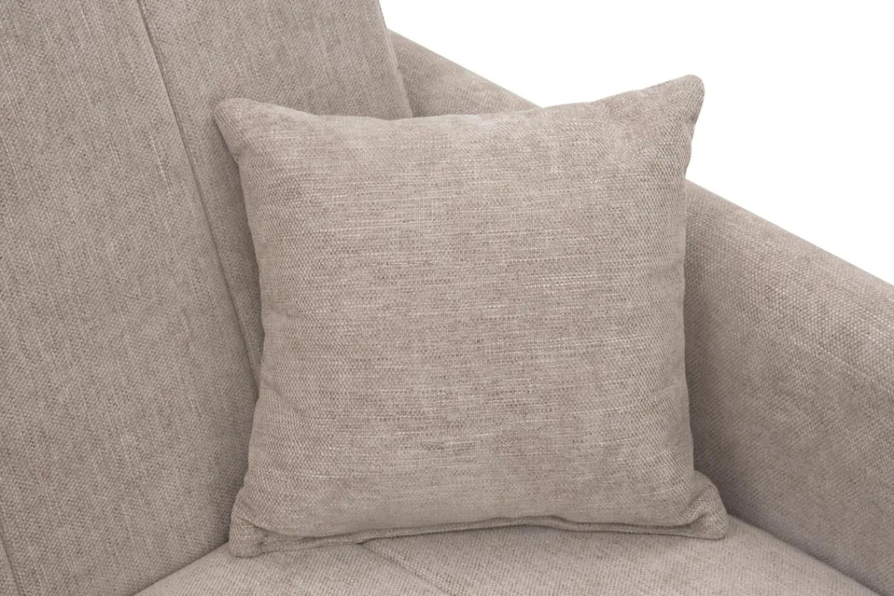 Beżowa tapicerka z tkaniny o wyraźnej, szenilowej strukturze i ciemne, drewniane nóżki sprawiają, że sofa nabiera elegancji.