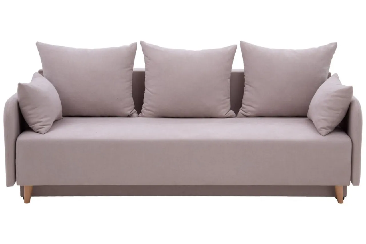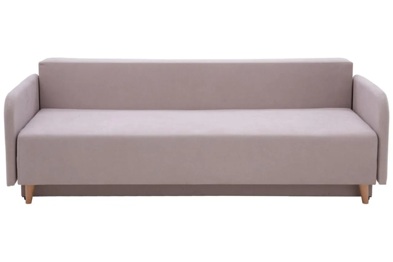 Przednie nóżki wykonano z drewna, dzięki czemu sofa estetycznie prezentuje się wśród jasnych, drewnianych mebli i we wnętrzach urządzonych w stylu skandynawskim.
