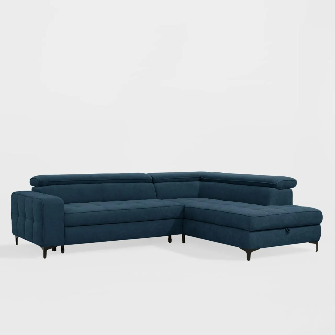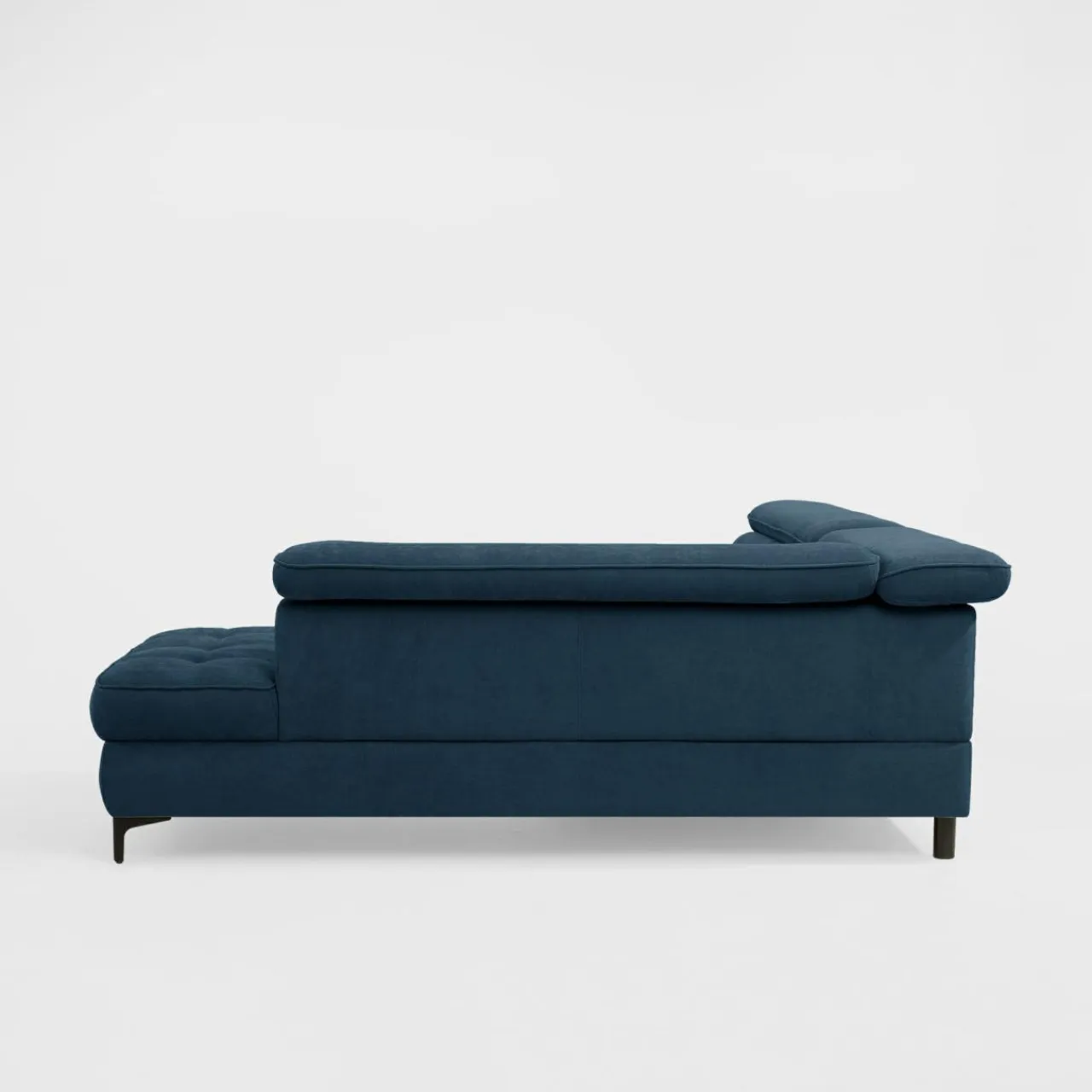 Narożnik NALA w granatowej tkaninie dopełni nowoczesny bądź marynistyczny salon. Przestronny mebel docenisz za regulowane zagłówki, pojemnik pod siedziskiem i przyjemne w dotyku obicie.