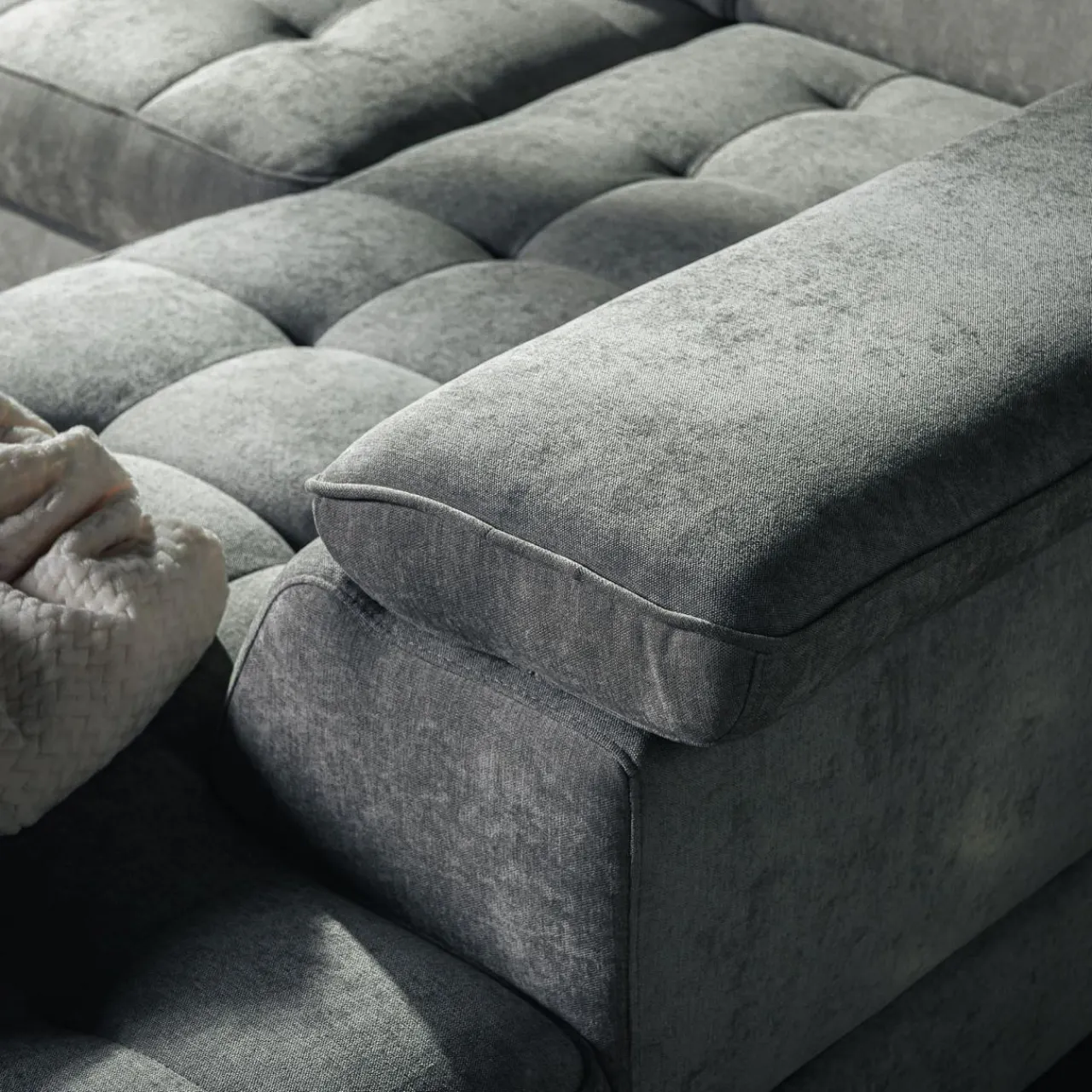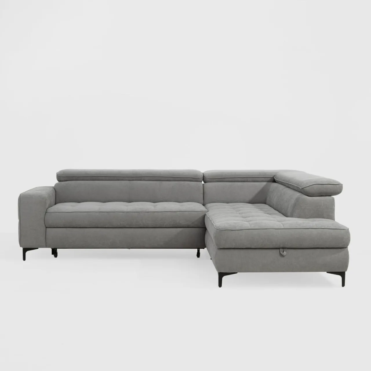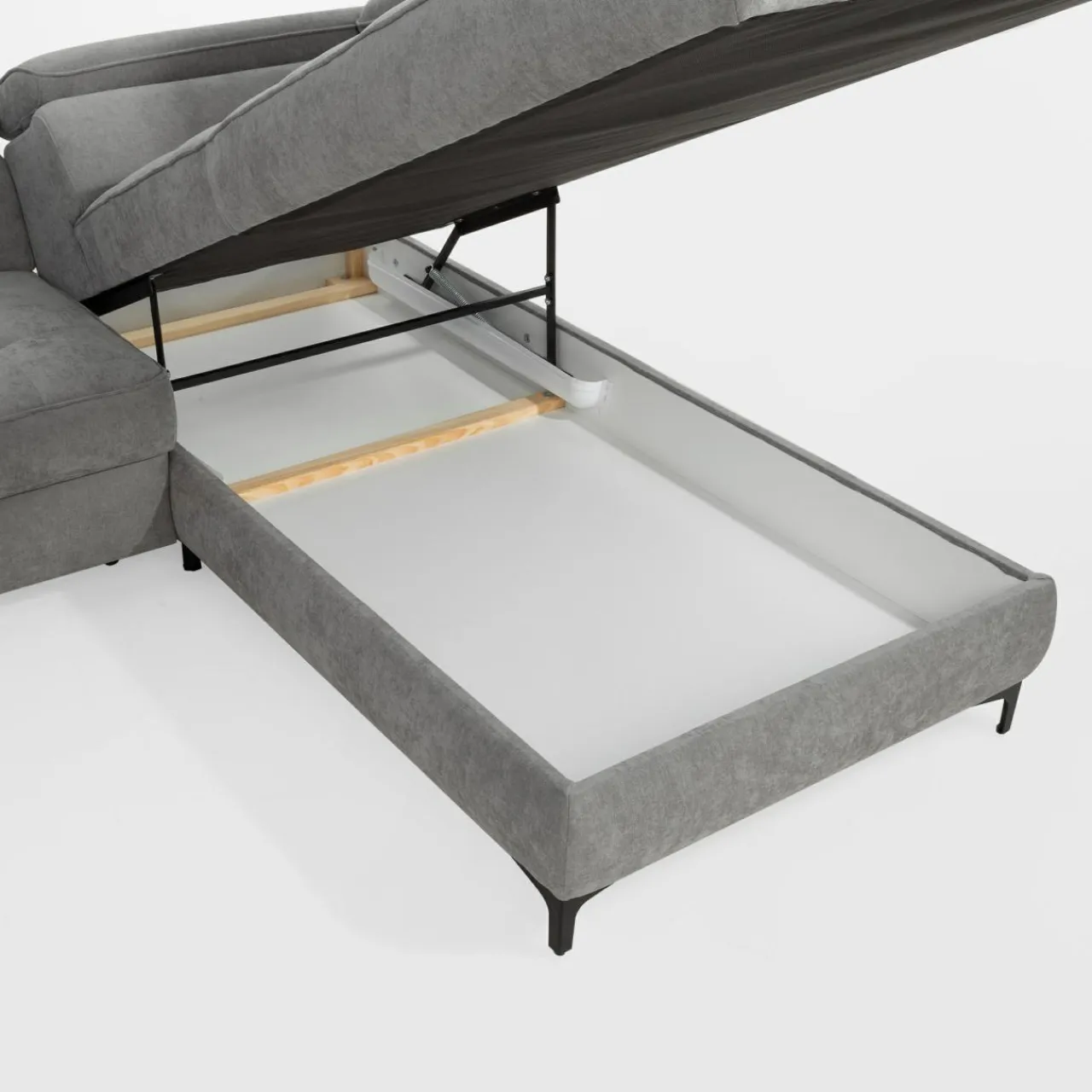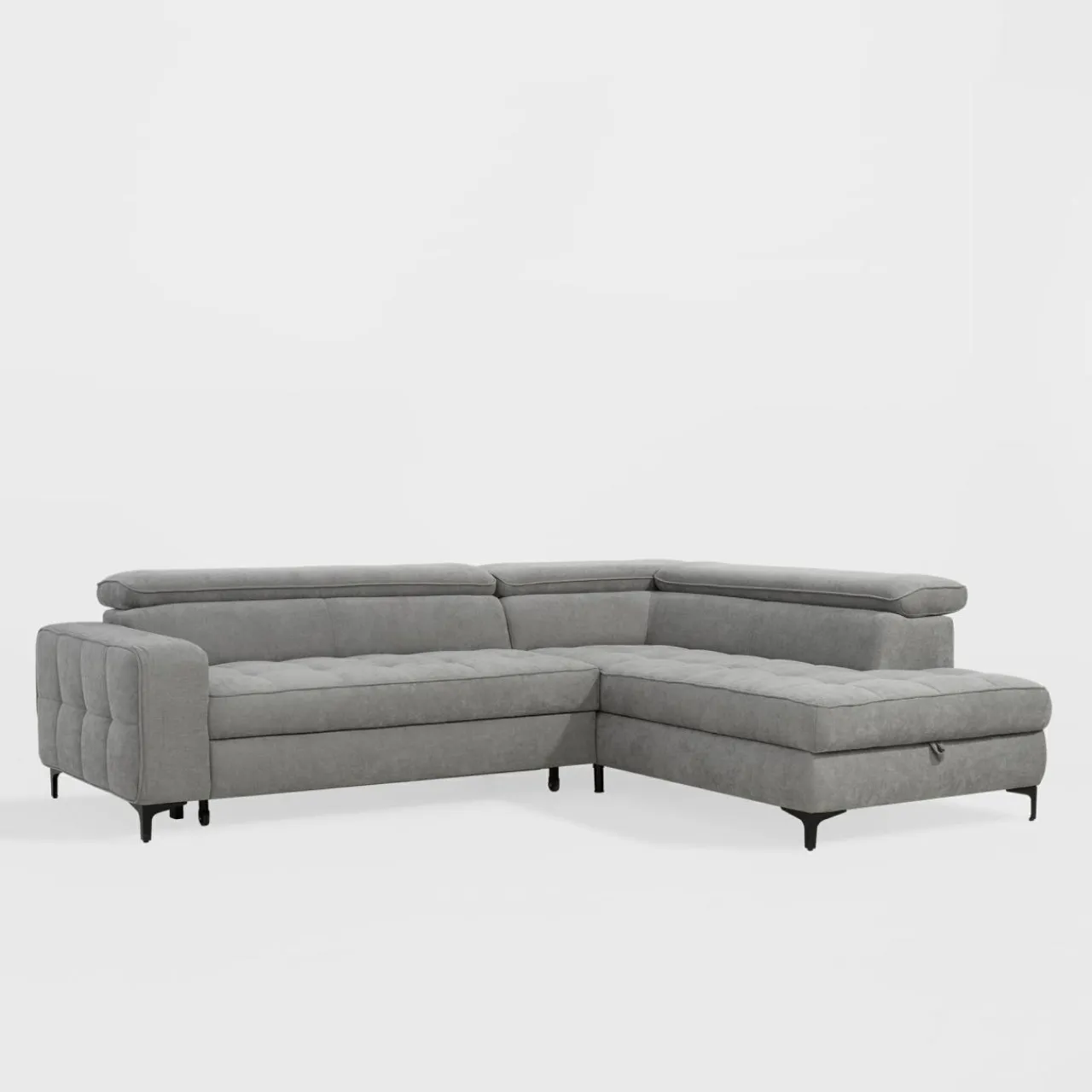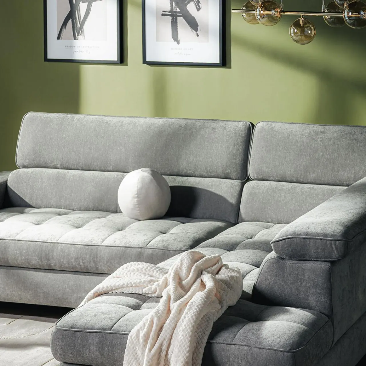Narożnik NALA w szarej tkaninie odnajdzie się w nowoczesnym salonie. Przestronny mebel docenisz za regulowane zagłówki, pojemnik pod siedziskiem i przyjemne w dotyku obicie.
