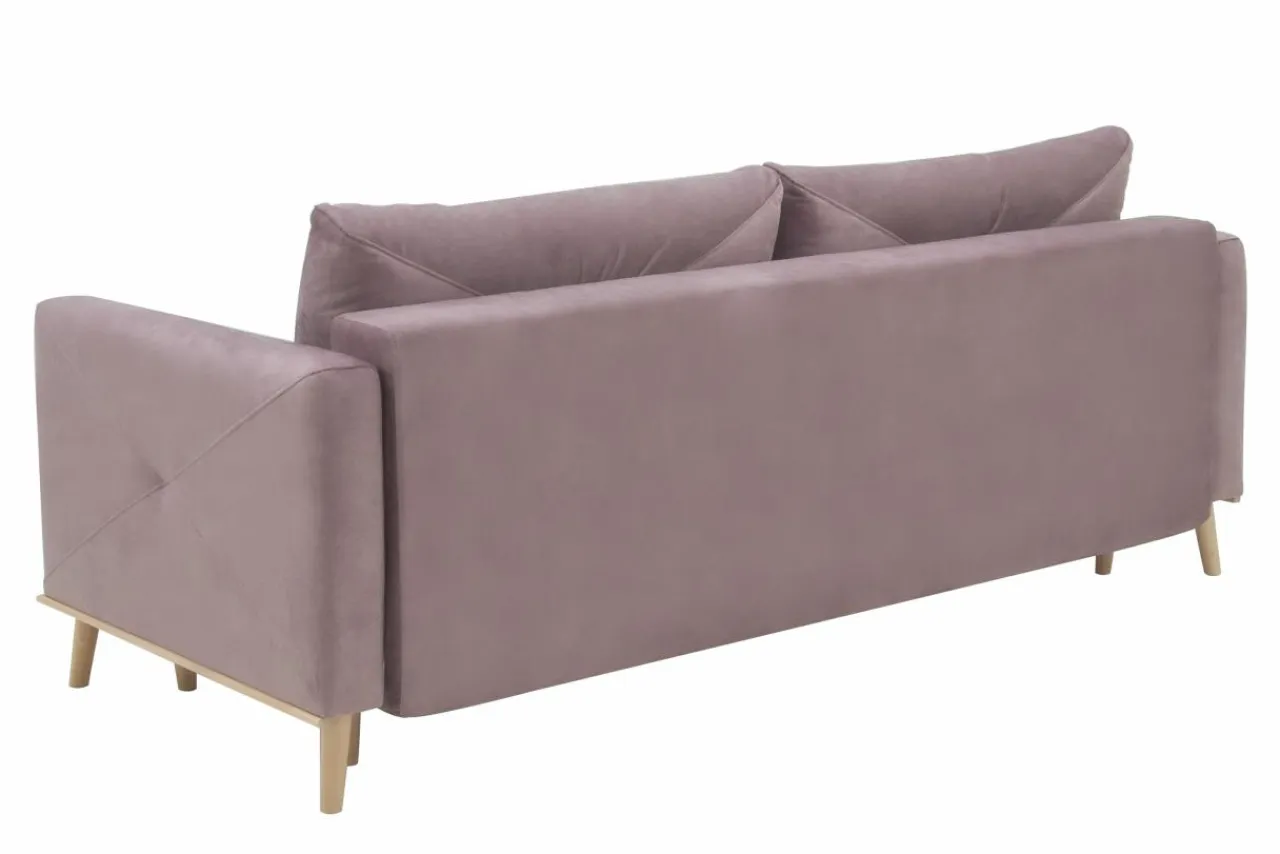 - Sofa wyróżnia się pastelowym, lawendowym kolorem oraz przeszyciami w kształcie dużych trójkątów.