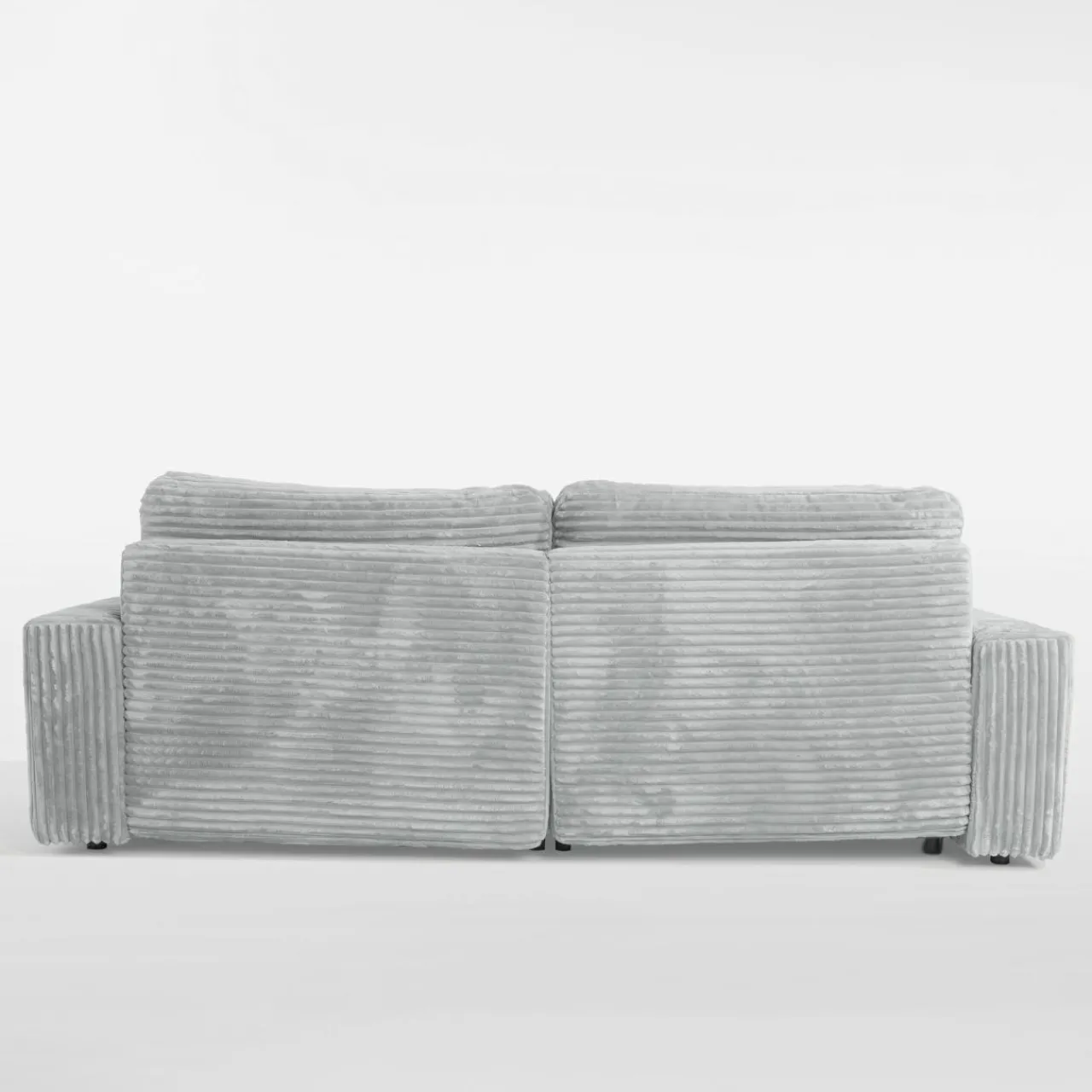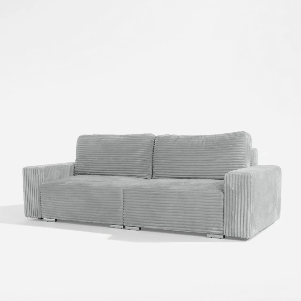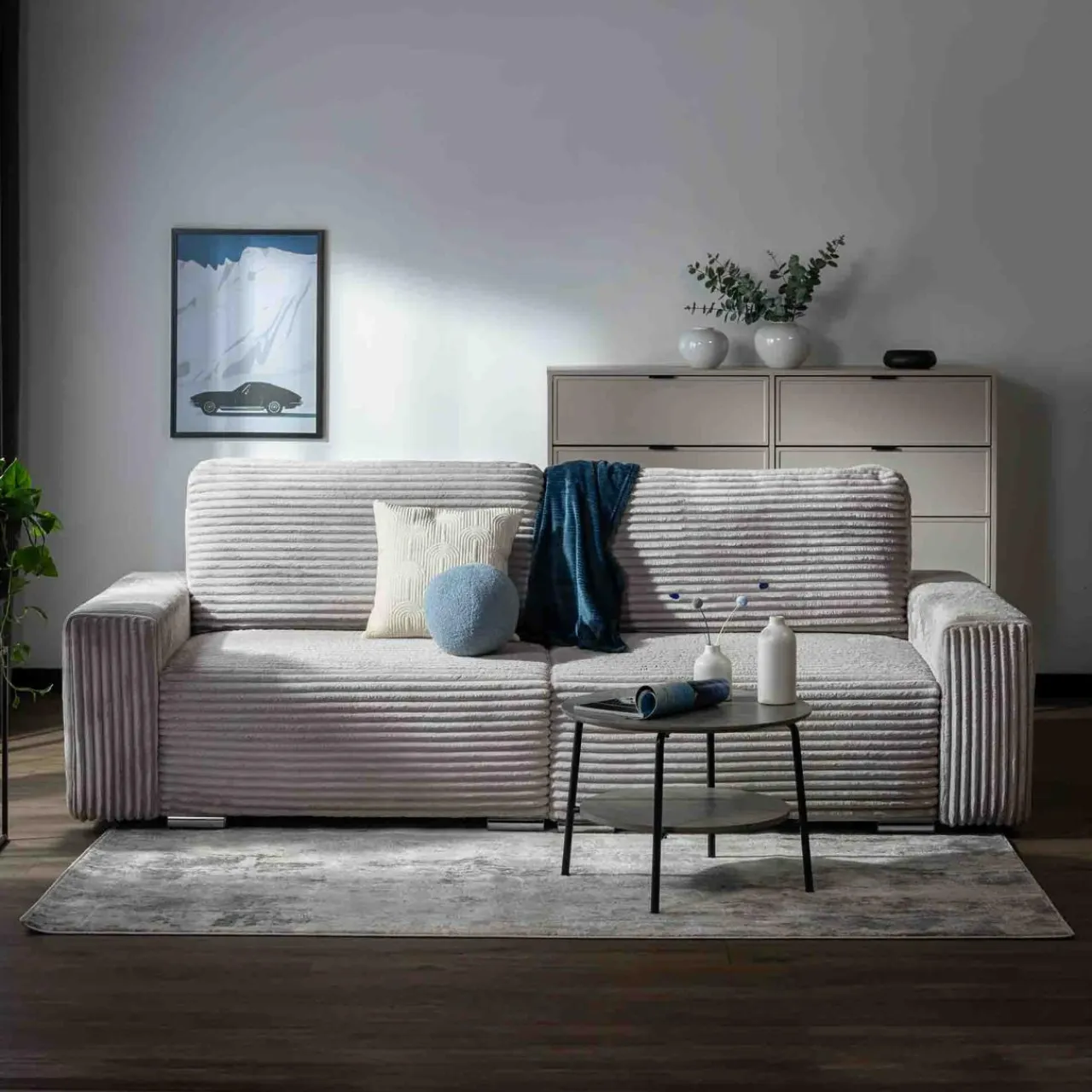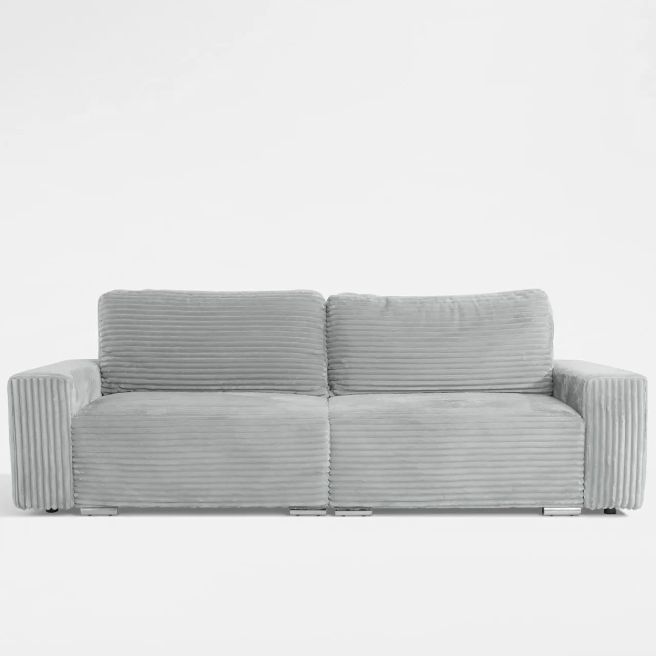 Sofa ANAFI wyróżnia się geometrycznym designem i sztruksową prążkowaną tkaniną, która zwraca uwagę i przełamuje jednolite gładkie powierzchnie. Zestawiona z neutralnymi barwami ścian wyciszy otoczenie, w którym z przyjemnością odpoczniesz.