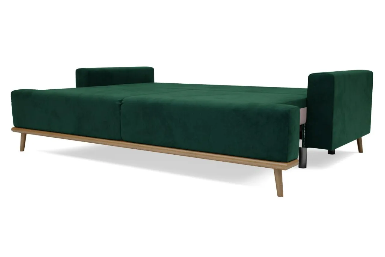Ciemnozielona sofa będzie świetnie prezentować się na tle białej lub jasnoszarej ściany, ożywi pomieszczenie i wprowadzi do niego nowoczesny klimat.