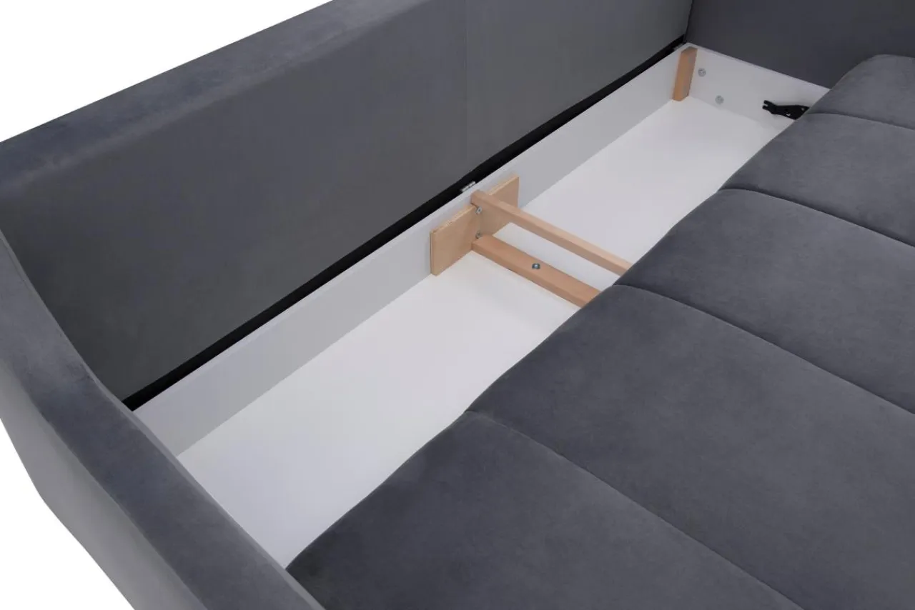 - Pod siedziskiem znajduje się pojemnik na pościel, który przyda się na przechowanie dodatkowego posłania.