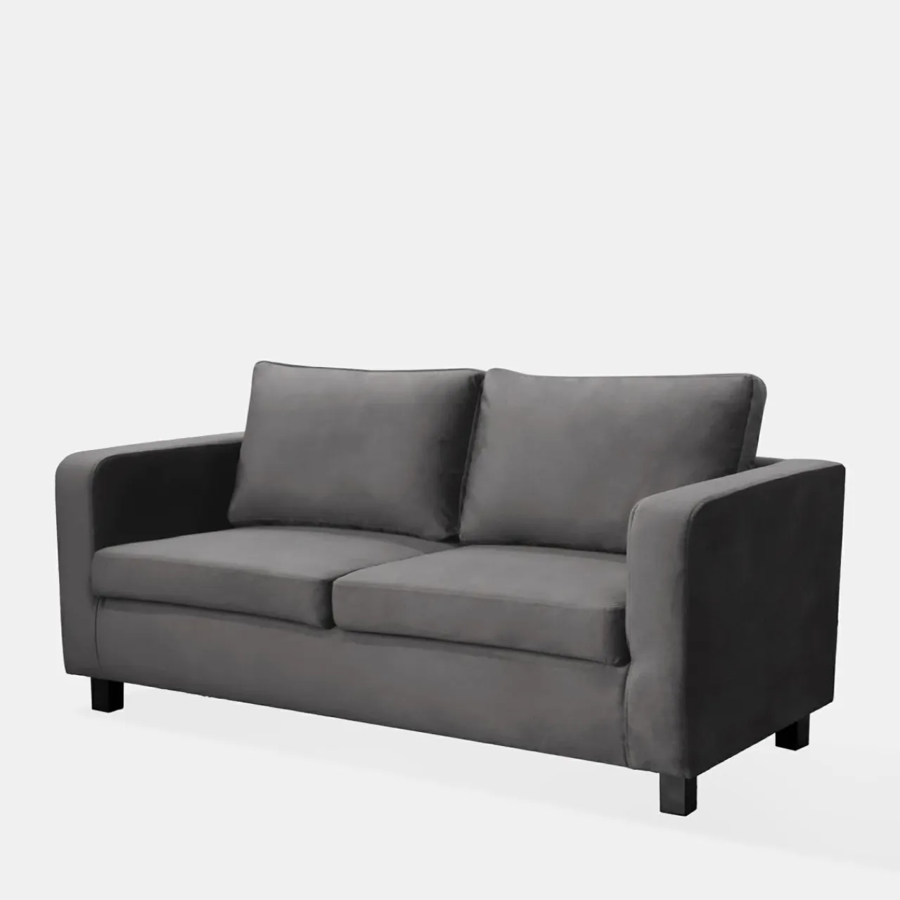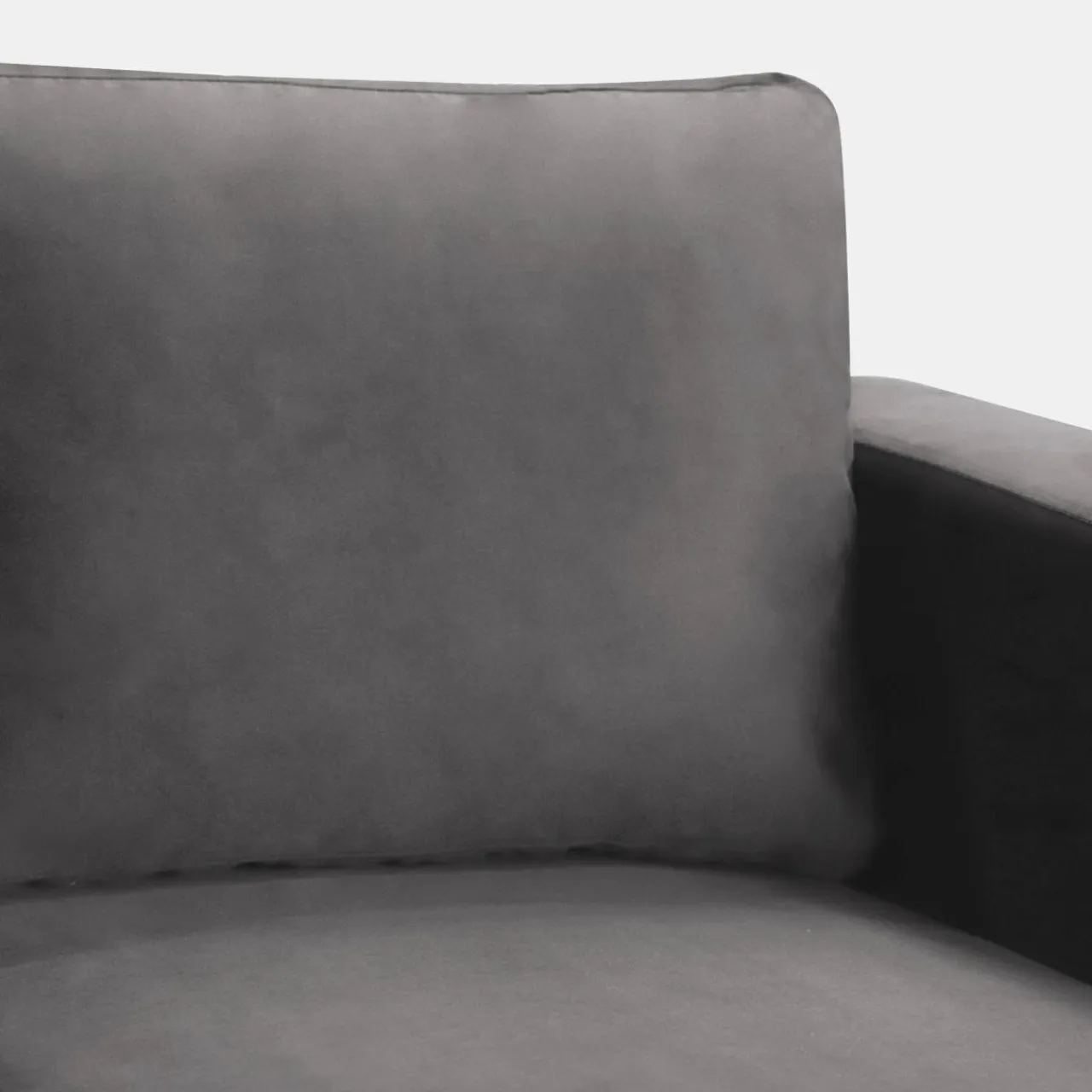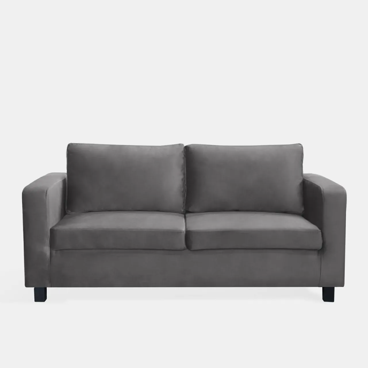Sofa 3-osobowa MINI MAX III w stalowym odcieniu łączy elegancję z komfortem, a delikatny połysk pluszu nadaje jej przytulnego charakteru.