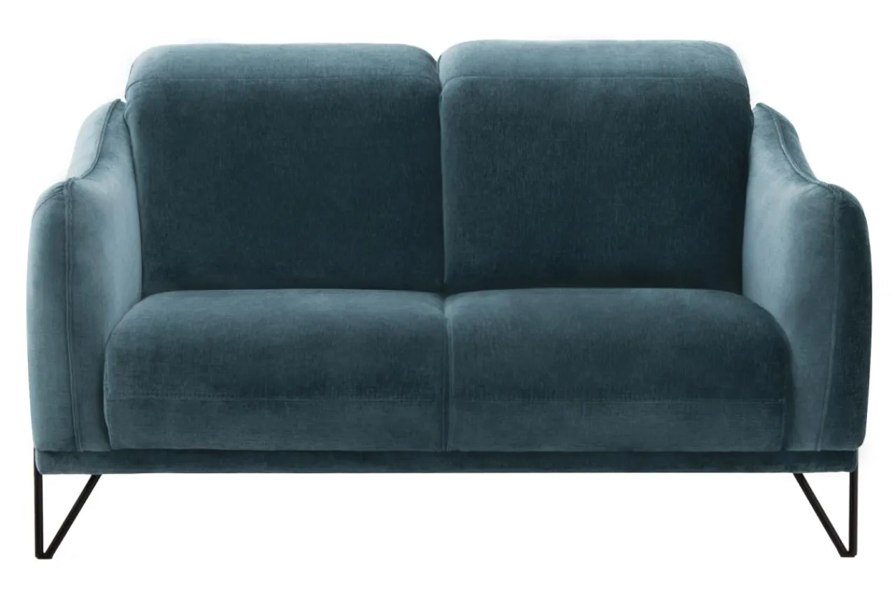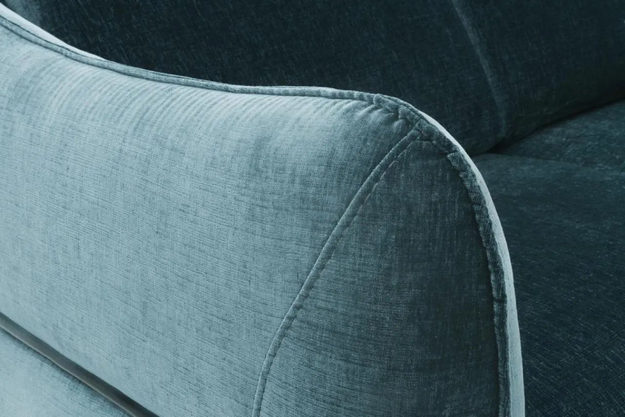 Wysokie metalowe nóżki i obłe kształty sprawiają, że sofa wpasowuje się w aktualnie obowiązujące trendy.