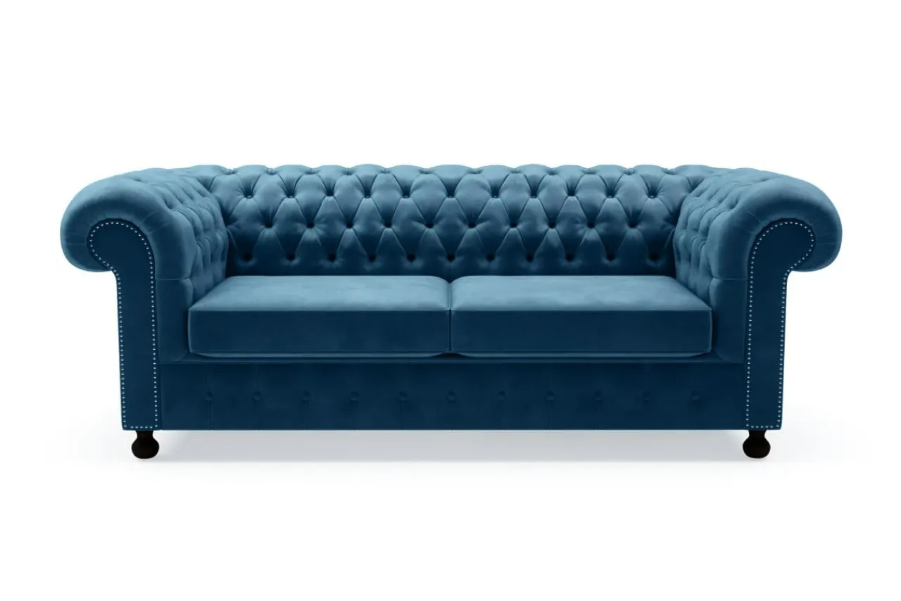 Niezwykle ozdobne oparcie sofy zostało pokryte pikowaniem oraz dekoracyjnymi, pokrytymi tkaniną, guzikami.