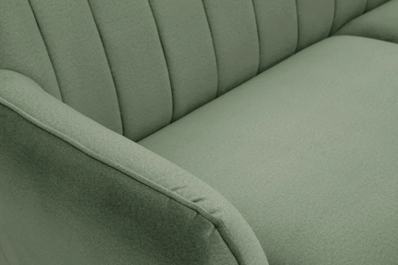 Miękka pluszowa tkanina w oryginalnym odcieniu zieleni i pionowe przeszycia dopełniają całości oraz sprawiają, że sofa LAHTI podkreśla wyjątkowość niewielkiego salonu lub pokoju dziennego, tworząc przyjemną strefę wypoczynkową.