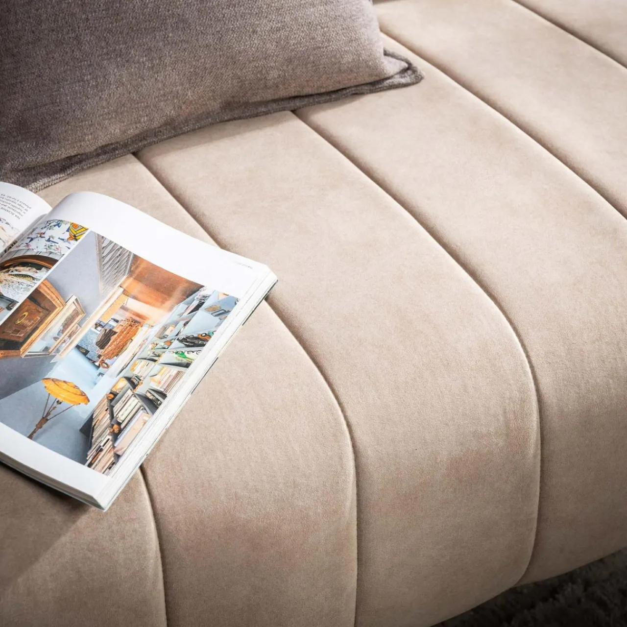 Mebel wyróżniają metalowe, ukośne nóżki oraz pionowe przeszycia zdobiące oparcie, siedzisko i wysokie podłokietniki.